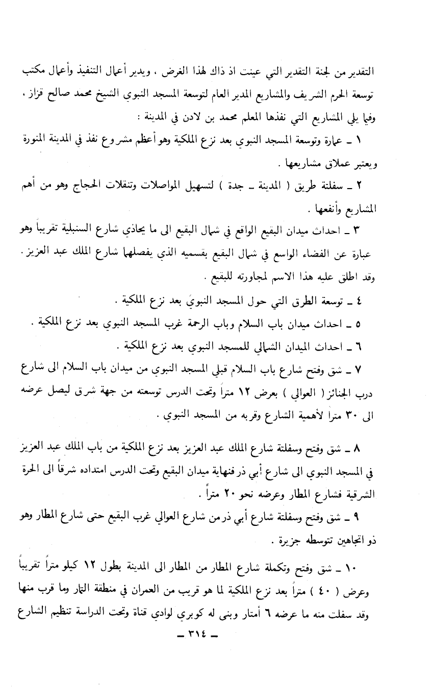 8 - شق وفتح وسفلتة شارع الملك عبد العزيز بعد نزع الملكية من باب الملك عبد العزيز في المسجد النبوي إلى شارع أبي ذر فنهاية ميدان البقيع وتحت الدرس امتداده شرقاً إلى الحرة الشرقية فشارع المطار وعرضه نحو 20 متراً.