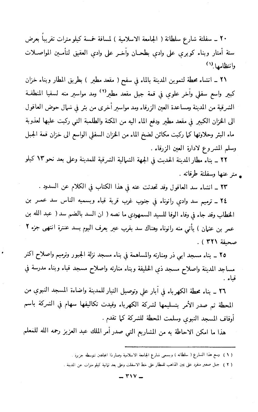 20 - سفلتتة شارع سلطانة (الجامعة الإسلامية) لمسافة خمسة كيلو مترات تقريباً بعرض ستة أمتار وبناء كوبري على وادي بطحان وآخر على وادي العقيق لتأمين المواصلات وانتظامها (1).