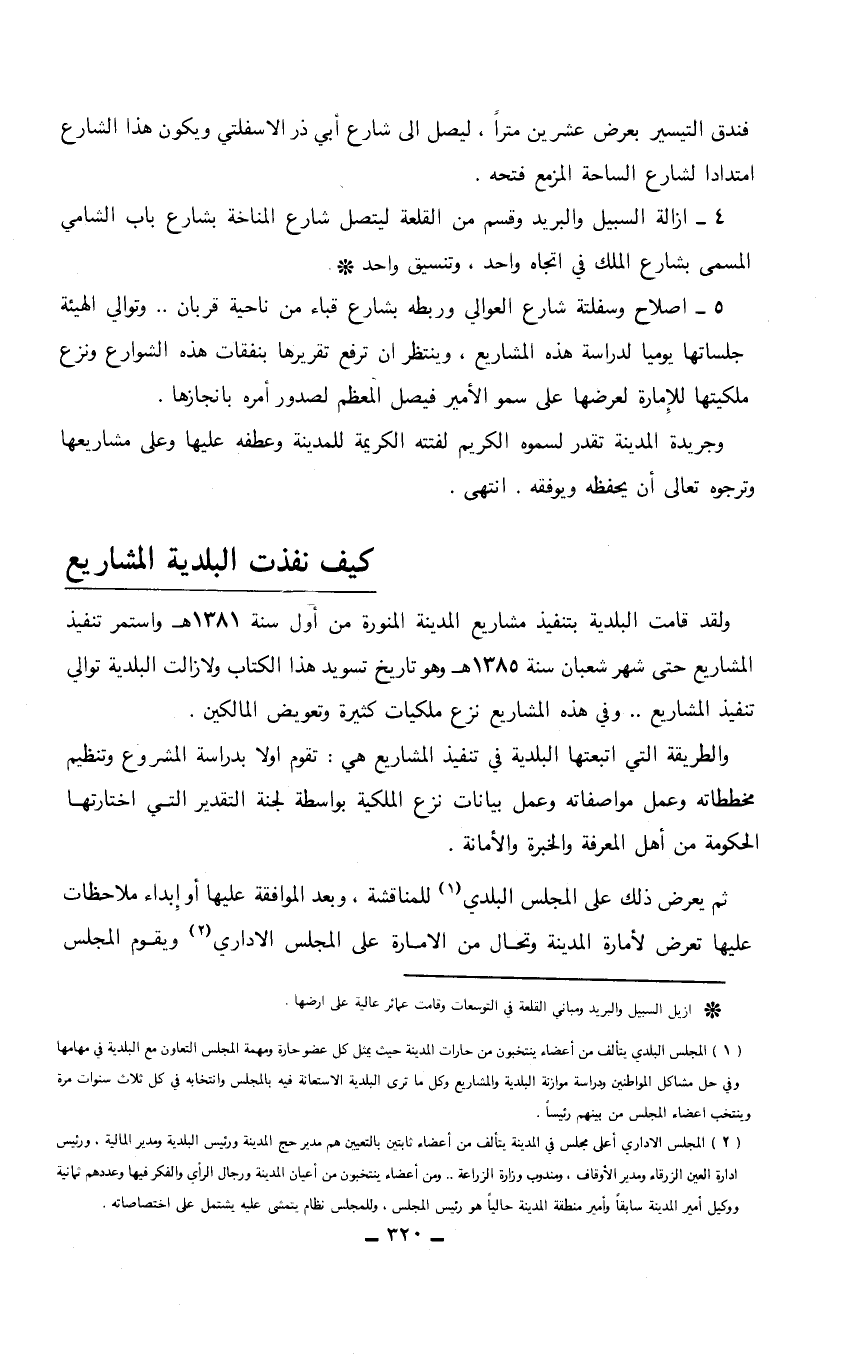 ولقد قامت البلدية بتنفيذ مشاريع المدينة المنورة من أول سنة 1381هـ واستمر تنفيذ المشاريع حتى شهر شعبان سنة 1385هـ وهو تاريخ تسويد هذا الكتاب ولا زالت البلدية توالي تنفيذ المشاريع ... وفي هذه المشاريع نزع ملكيات كثيرة وتعويض المالكين.