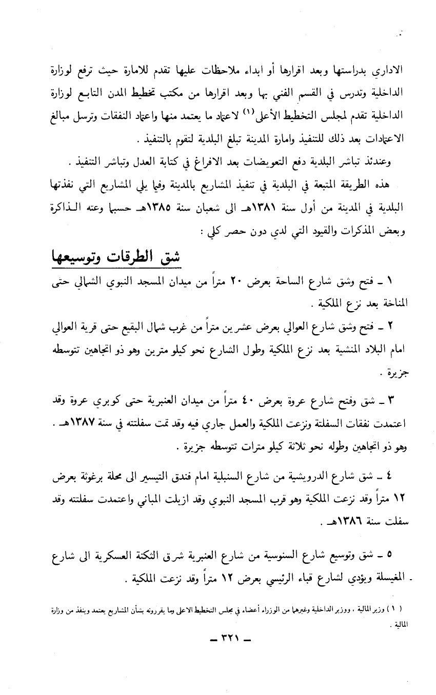 الاداري بدراستها وبعد اقرارها أو ابداء ملاحظات عليها تقدم للامارة حيث ترفع لوزارة الداخلية وتدرس في القسم الفني بها وبعد اقرارها من مكتب تخطيط المدن التابع لوزارة الداخلية تقدم لمجلس التخطيط الأعلى (1) لاعتماد ما يعتمد منها واعتماد النفقات وترسل مبالغ الاعتمادات بعد ذلك للتنفيذ وامارة المدينة تبلغ البلدية لتقوم بالتنفيذ. وعندئذ تباشر البلدية دفع التعويضات بعد الافراغ في كتابة العدل وتباشر التنفيذ. هذه الطريقة المتبعة في البلدية في تنفيذ المشاريع بالمدينة وفيما يلي المشاريع التي نفذتها البلدية في المدينة من أول سنة 1381هـ إلى شعبان سنة 1385هـ حسبما وعته الذاكرة وبعض المذكرات والقيود التي لدي دون حصر كلي: