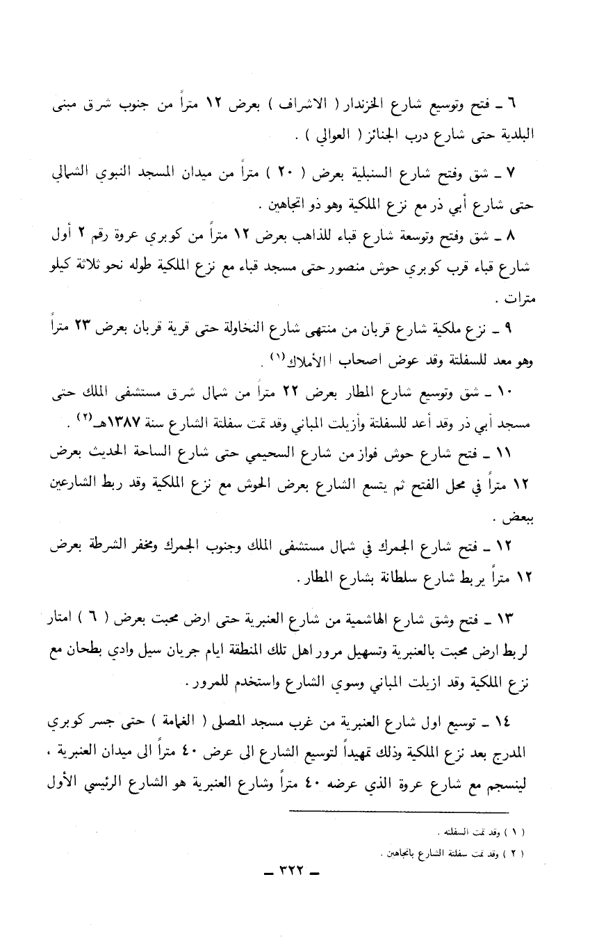 13 - فتح وشق شارع الهاشمية من شارع العنبرية حتى ارض محبت بعرض (6) أمتار لربط أرض محبت بالعنبرية وتسهيل مرور أهل تلك المنطقة أيام جريان سيل وادي بطحان مع نزع الملكية وقد أزيلت المباني وسوي الشارع واستخدم للمرور.