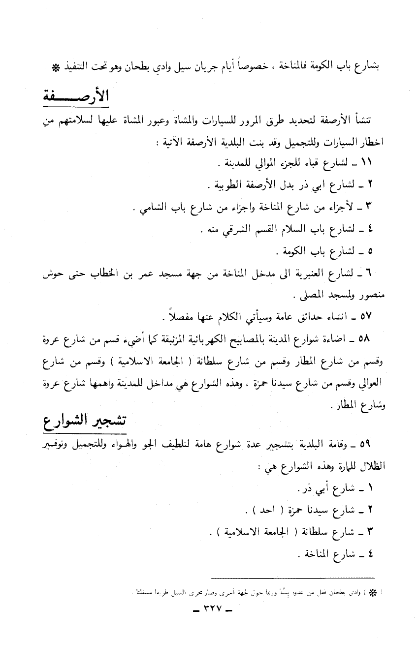 58 - اضاءة شوارع المدينة بالمصابيح الكهربائية المزئبقة كما أضيء قسم من شارع عروة وقسم من شارع المطار وقسم من شارع سلطانة (الجامعة الإسلامية) وقسم من شارع العوالي وقسم من شارع سيدنا حمزة، وهذه الشوارع هي مداخل للمدينة وأهمها شارع عروة وشارع المطار.