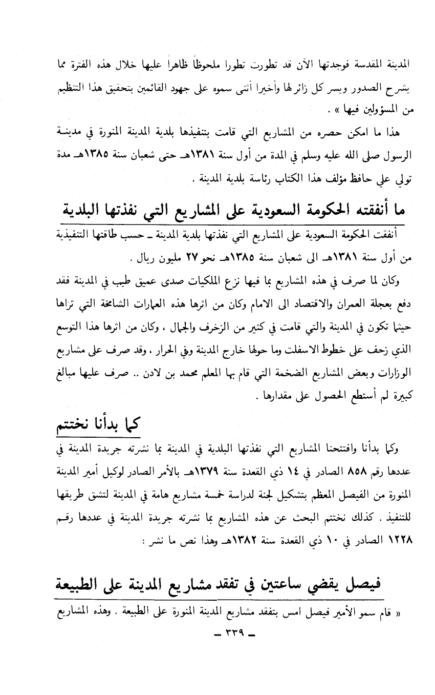 أنفقت الحكومة السعودية على المشاريع التي نفذتها بلدية المدينة- حسب طاقتها التنفيذية من أول سنة 1381هـ إلى شعبان سنة 1385هـ نحو 27 مليون ريال. وكان لما صرف هذه المشاريع بما فيها نزع الملكيات صدى عميق طيب في المدينة فقد دفع بعجلة العمران والاقتصاد إلى الأمام وكان من أثرها هذه العمارات الشامخة التي تراها حيثما تكون في المدينة والتي قامت في كثير من الزخرف والجمال، وكان من أثرها هذا التوسع الذي زحف على خطوط الاسفلت وما حولها خارج المدينة وفي الحرار، وقد صرف على مشاريع الوزارات وبعض المشاريع الضخمة التي قام بها المعلم محمد بن لادن ... صرف عليها مبالغ كبيرة لم استطع الحصول على مقدارها.