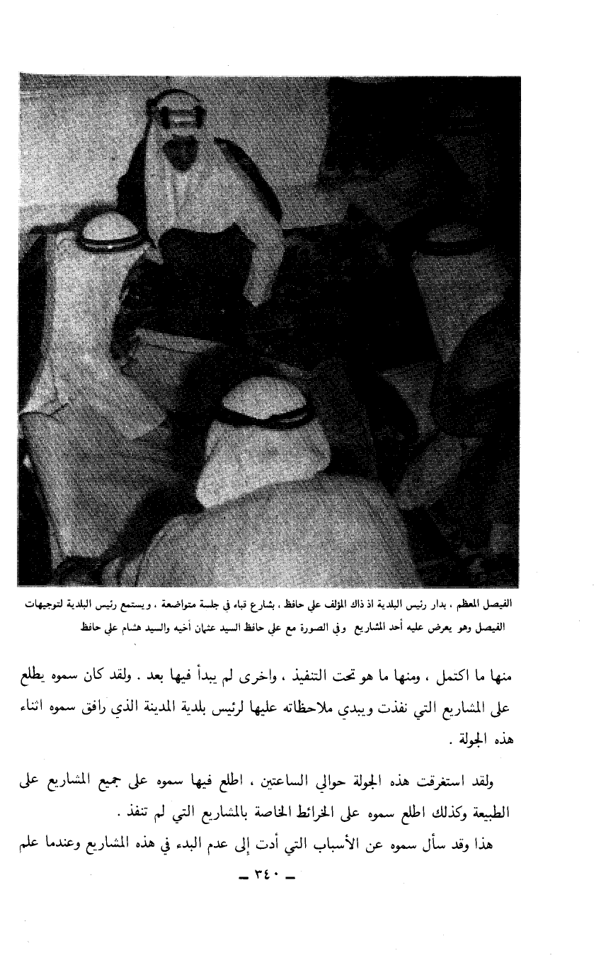 ((الفيصل المعظم، بدار رئيس البلدية إذ ذاك المؤلف علي حافظ، بشارع قباء في جلسة متواضعة، ويستمع رئيس البلدية لتوجيها الفيصل وهو يعرض عليه أحد المشاريع وفي الصورة مع علي حافظ السيد عثمان أخيه والسيد هشام علي حافظ))