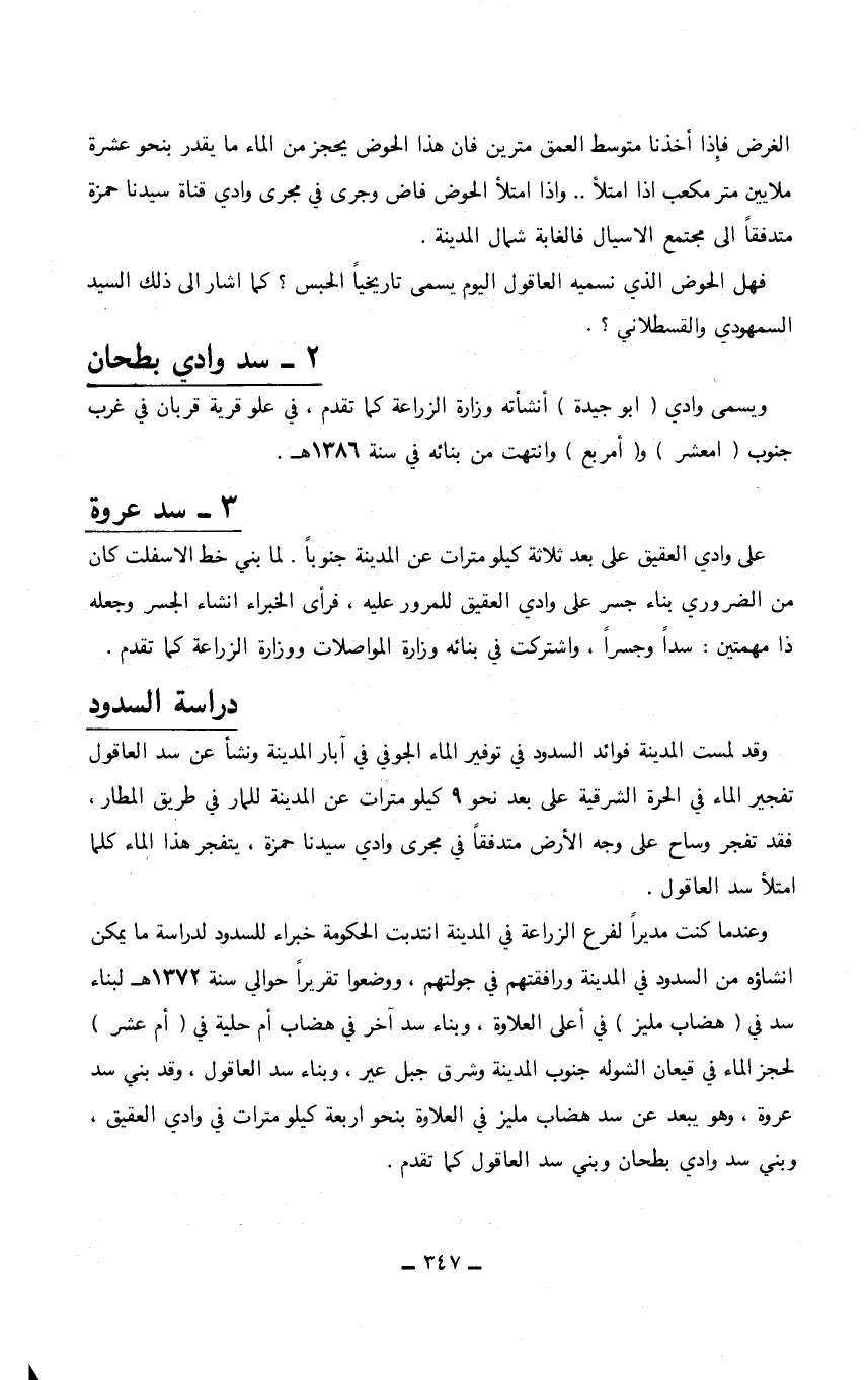 وعندما كنت مديراً لفرع الزراعة في المدينة انتدبت الحكومة خبراء للسدود لدراسة ما يمكن انشاؤه من السدود في المدينة ورافقتهم في جولتهم، ووضعوا تقريراً حوالي سنة 1372هـ لبناء سد في (هضاب مليز) في أعلى العلاوة، وبناء سد آخر في هضاب أم حلية في (أم عشر) لحجز الماء في قيعان الشوله جنوب المدينة وشرق جبل عير، وبناء سد العاقول، وقد بنى سد عروة، وهو يبعد عن سد هضاب مليز في العلاوة بنحو أربعة كيلو مترات في وادي العقيق، وبني سد وادي بطحان وبني سد العاقول كما تقدم.…