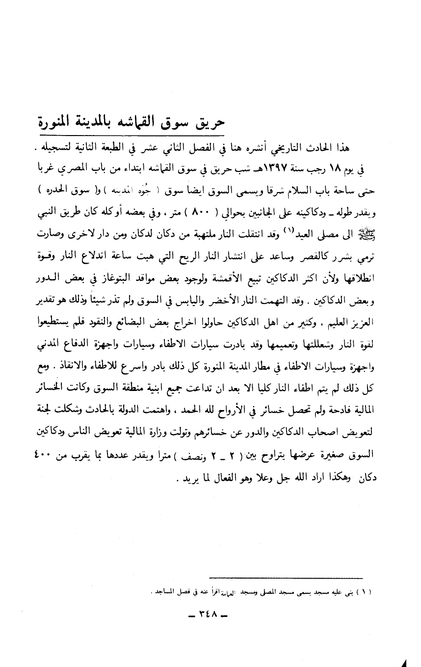 هذا الحادث التاريخي أنشره هنا في الفصل الثاني عشر في الطبعة الثانية لتسجيله، في يوم 18 رجب سنة 1397هـ شب حريق في سوق القماشه ابتداء من باب المصري غرباً حتى ساحة باب السلام شرقاً ويسمى السوق أيضاً سوق (جوه المدينة) و (سوق الحدره) ويقدر طوله - ودكاكينه على الجانبين بحوالي (800) متر، وفي بعضه أو كله كان طريق النبي صلى الله عليه وسلم إلى مصلى العيد (1) وقد انتقلت النار ملتهبة من دكان لدكان ومن دار لأخرى وصارت ترمي بشرر كالقصر وساعد على انتشار النار الريح التي هبت ساعة اندلاع النار وقوة انطلاقها ولأن أكثر الدكاكين تبيع الأقمشة ولوجود بعض مواقد البتوغاز في بعض الدور وبعض الدكاكين. وقد التهمت النار الأخضر واليابس في السوق ولم تذر شيئاً وذلك هو تقدير العزيز العليم، وكثير من أهل الدكاكين حاولوا اخراج بعض البضائع والنقود فلم يستطيعوا لقوة النار وشعللتها وتعميمها وقد بادرت سيارات الاطفاء وسيارات وأجهزة الدفاع المدني وأجهزة وسيارات الإطفاء في مطار المدينة المنورة كل ذلك بادر وأسرع للاطفاء والانقاذ. ومع كل ذلك لم يتم اطفاء النار كلياً إلا بعد أن تداعت جميع أبنية منطقة السوق وكانت الخسائر المالية فادحة ولم تحصل خسائر في الأرواح لله الحمد، واهتمت الدولة بالحادث وشكلت لجنة لتعويض أصحاب الدكاكين والدور عن خسائرهم وتولت وزارة المالية تعويض الناس ودكاكين السوق صغيرة عرضها يتراوح بين (2 - 2 ونصف) متراً ويقدر عددها بما يقرب من 400 دكان وهكذا أراد الله جل وعلا وهو الفعال لما يريد.