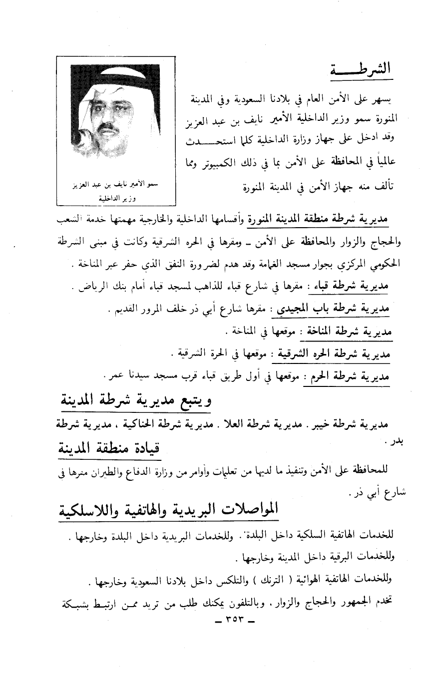 يسهر على الأمن العام في بلادنا السعودية وفي المدينة المنورة سمو وزير الداخلية الأمير نايف بن عبد العزيز وقد ادخل على جهاز وزارة الداخلية كلما استحدث عالمياً في المحافظة على الأمن بما في ذلك الكمبيوتر ومما تألف منه جهاز الأمن في المدينة المنورة.