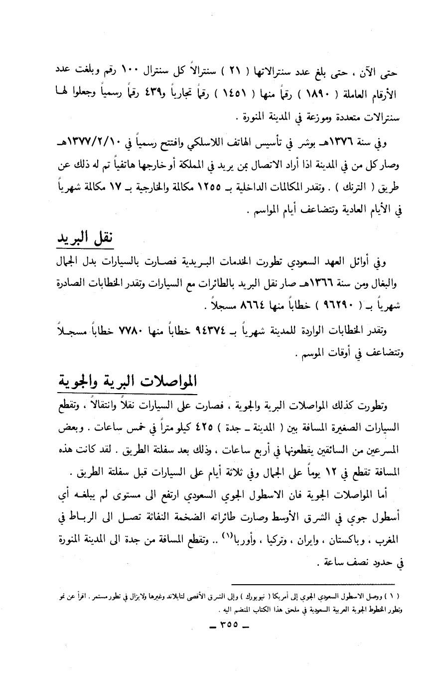 وتطورت كذلك المواصلات البرية والجوية، فصارت على السيارات نقلاً وانتقالاً، وتقطع السيارات الصغيرة المسافة بين (المدينة- جدة) 425 كيلو متراً في خمس ساعات. وبعض المسرعين من السائقين يقطعونها في أربع ساعات، وذلك بعد سفلتة الطريق. لقد كانت هذه المسافة تقطع في 12 يوماً على الجمال وفي ثلاثة أيام على السيارات قبل سفلتة الطريق. أما المواصلات الجوية فإن الأسطول الجوي السعودي ارتفع إلى مستوى لم يبلغه أي أسطول جوي في الشرق الأوسط وصارت طائراته الضخمة النفاثة تصل إلى الرباط في المغرب، وباكستان، وايران، وتركيا، وأوربا (1) .. وتقطع المسافة من جدة إلى المدينة المنورة في حدود نصف ساعة.