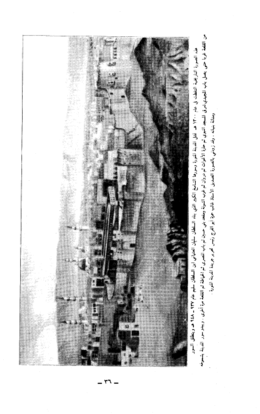 ((هذه الصورة التاريخية التقطت في عام 1300 هـ تمثل المدينة المنورة وسورها الشامخ الكبير الذي بناه السلطان سليمان العثماني ابن السلطان سليم عام 937 - 948هـ وينطلق السور من القلعة غربا حتى يصل باب المجيدي شرق المسجد النبوي ثم حارة الأغواث ثم دروان ثم غرب الشونة ومقعد بني حسين ثم باب المصري ثم الحماطة ثم القلعة مرة أخرى. ويبدو سور المدينة يشموخه ومتانة بنيانه، وقد زودني بالصورة الصديق الأستاذ غالب حمزة أبو الفرج رئيس تحرير جريدة المدينة المنورة)).…