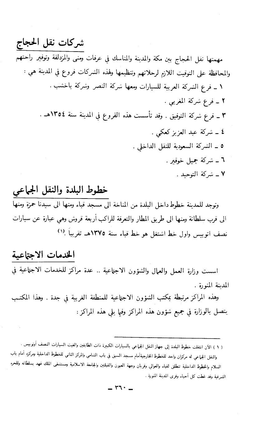 (1) الآن انتقلت خطوط البلدة إلى جهاز النقل الجماعي بالسيارات الكبيرة ذات الطابقين والغيت السيارات النصف أوتوبيس. والنقل الجماعي له مركزان واحد للخطوط الخارجية أمام مسجد السبق في باب الشامي والمركز الثاني للخطوط الداخلية ومركزه أمام باب السلام والخطوط الداخلية وتنطلق لقباء والعوالي وقربان وجهة العيون والقبلتين والجامعة الاسلامية ومستشفى الملك فهد بسلطانه وللحره الشرقية وقد غطت كل أحياء وقرى المدينة المنورة.