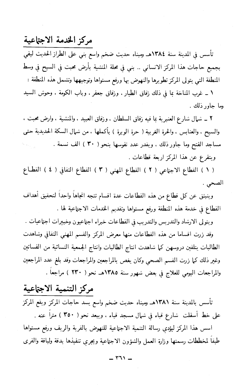 وينبثق عن كل قطاع من هذه القطاعات عدة أقسام تتجه اتجاهاً واحداً لتحقيق أهداف القطاع في خدمة هذه المنطقة ورفع مستواها وتقديم الخدمات الاجتماعية لها. ويتولى الارشاد والتدريس والتدريب في القطاعات خبراء اجتماعيون وخبيرات اجتماعيات. وقد زرت أقساماً من هذه القطاعات منها معرض المركز والقسم المهني الثقافي وشاهدت الطالبات يتلقين دروسهن كما شاهدت انتاج الطالبات وانتاج الجمعية النسائية من الفساتين وغير ذلك كما زرت القسم الصحي وكان يغص بالمراجعين والمراجعات وقد بلغ عدد المراجعين والمراجعات اليومي للعلاج في بعض شهور سنة 1385هـ نحو (230) مراجعاً.