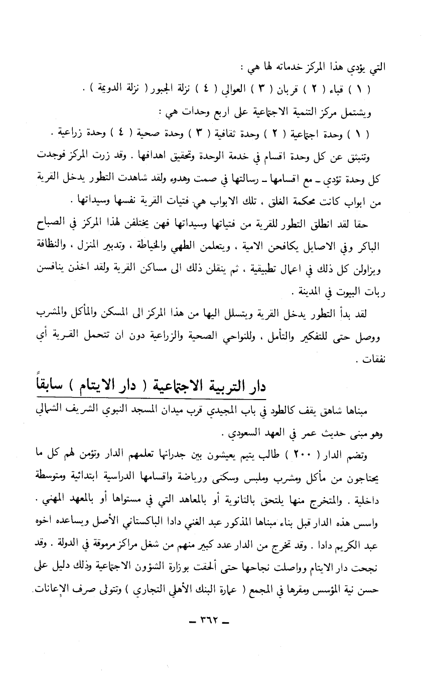 وتنبثق عن كل وحدة أقسام في خدمة الوحدة وتحقيق أهدافها. وقد زرت المركز فوجدت كل وحدة تؤدي- مع أقسامها- رسالتها في صمت وهدوء ولقد شاهدت التطور يدخل القرية من أبواب كانت محكمة الغلق، تلك الأبواب هي فتيات القرية نفسها وسيداتها. حقا لقد انطلق التطور للقرية من فتياتها وسيداتها فهن يختلفن لهذا المركز في الصباح الباكر وفي الاصايل يكافحن الأمية، ويتعلمن الطهي والخياطة، وتدبير المنزل، والنظافة ويزاولون كل ذلك في أعمال تطبيقية، ثم ينقلن ذلك إلى مساكن القرية ولقد أخذن ينافسن ربات البيوت في المدينة. لقد بدأ التطور يدخل القرية ويتسلل إليها من هذا المركز إلى المسكن والمأكل والمشرب ووصل حتى للتفكير والتأمل، وللنواحي الصحية والزراعية دون أن تتحمل القرية أي نفقات.
