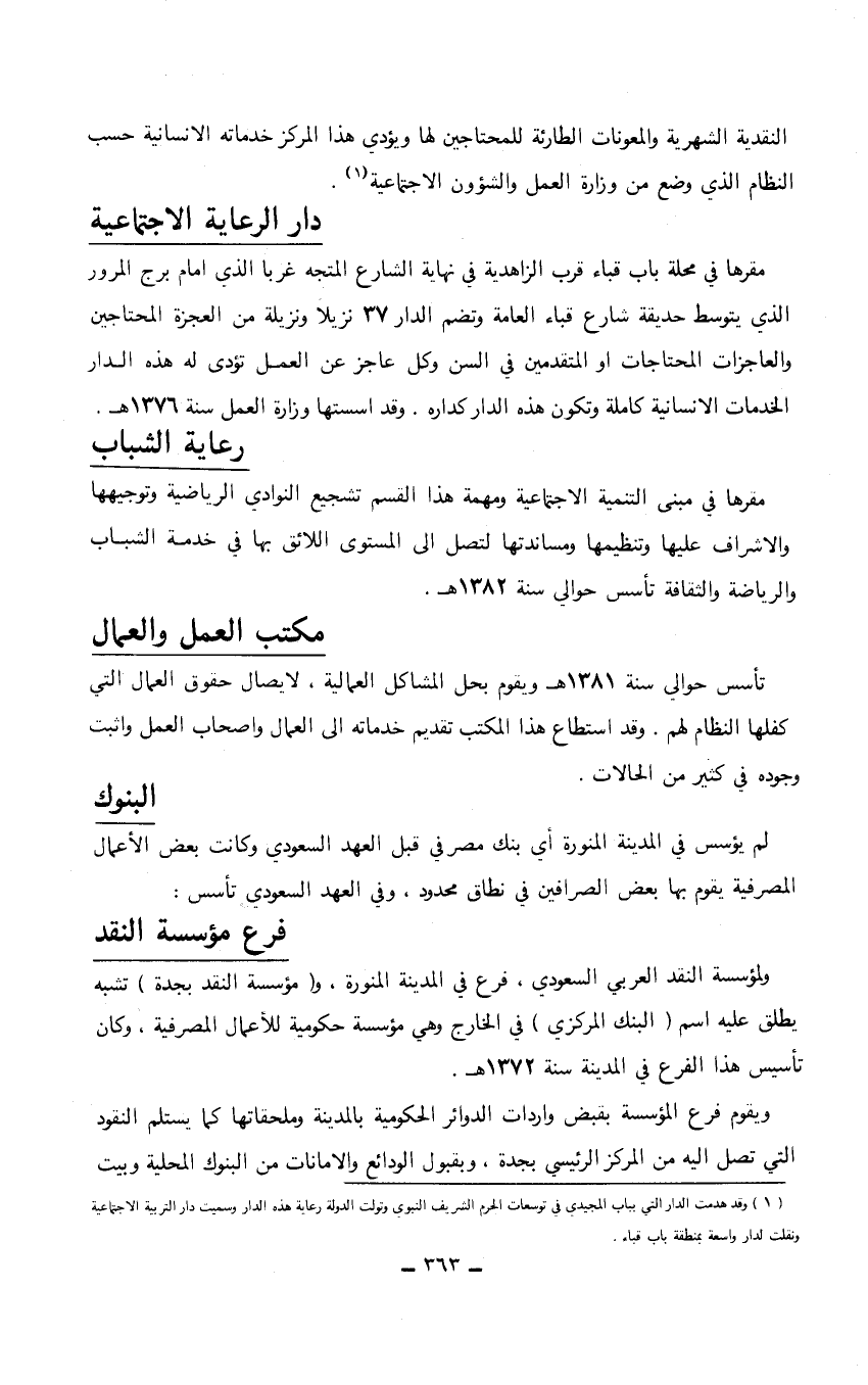 تأسس حوالي سنة 1381هـ ويقوم بحل المشاكل العمالية، لايصال حقوق العمال التي كفلها النظام لهم، وقد استطاع هذا المكتب تقديم خدماته إلى العمال وأصحاب العمل وأثبت وجوده في كثير من الحالات. البنوك لم يؤسس في المدينة المنورة أي بنك مصرفي قبل العهد السعودي وكانت بعض الأعمال المصرفية يقوم بها بعض الصرافين في نطاق محدود. وفي العهد السعودي تأسس: