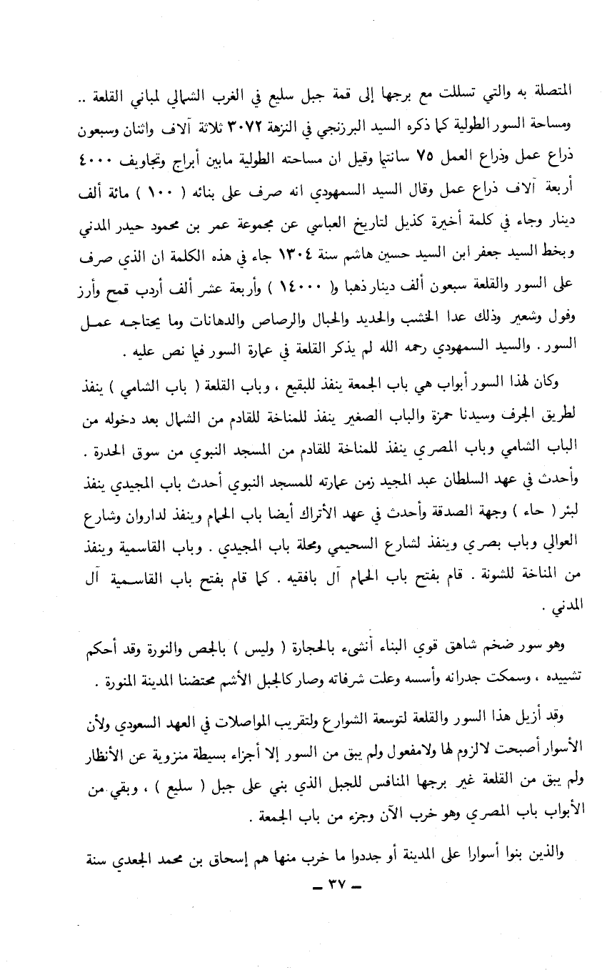 المتصلة به والتي تسللت مع برجها إلى قمة جبل سليع في الغرب الشمالي لمباني القلعة ... ومساحة السور الطولية كما ذكره السيد البرزنجي في النزهة 3072 ثلاثة آلاف واثنان وسبعون ذراع عمل وذراع العمل 75 سانتيما وقيل أن مساحته الطولية ما بين أبراج وتجاويف 4000 أربعة آلاف ذراع عمل وقال السيد السمهودي أنه صرف على بنائه (100) مائة ألف دينار وجاء في كلمة أخيرة كذيل لتاريخ العباسي عن مجموعة عمر بن محمود حيد المدني وبخط السيد جعفر ابن السيد حسين هاشم سنة 1304 جاء في هذه الكلمة أن الذي صرف على السور والقلعة سبعون ألف دينار ذهبا و (14000) وأربعة عشرألف أردب قمح وأرز وفول وشعير وذلك عدا الخشب والحديد والحبال والرصاص والدهانات وما يحتاجه عمل السور. والسيد السمهودي رحمه الله لم يذكر القلعة في عمارة السور فيما نص عليه.