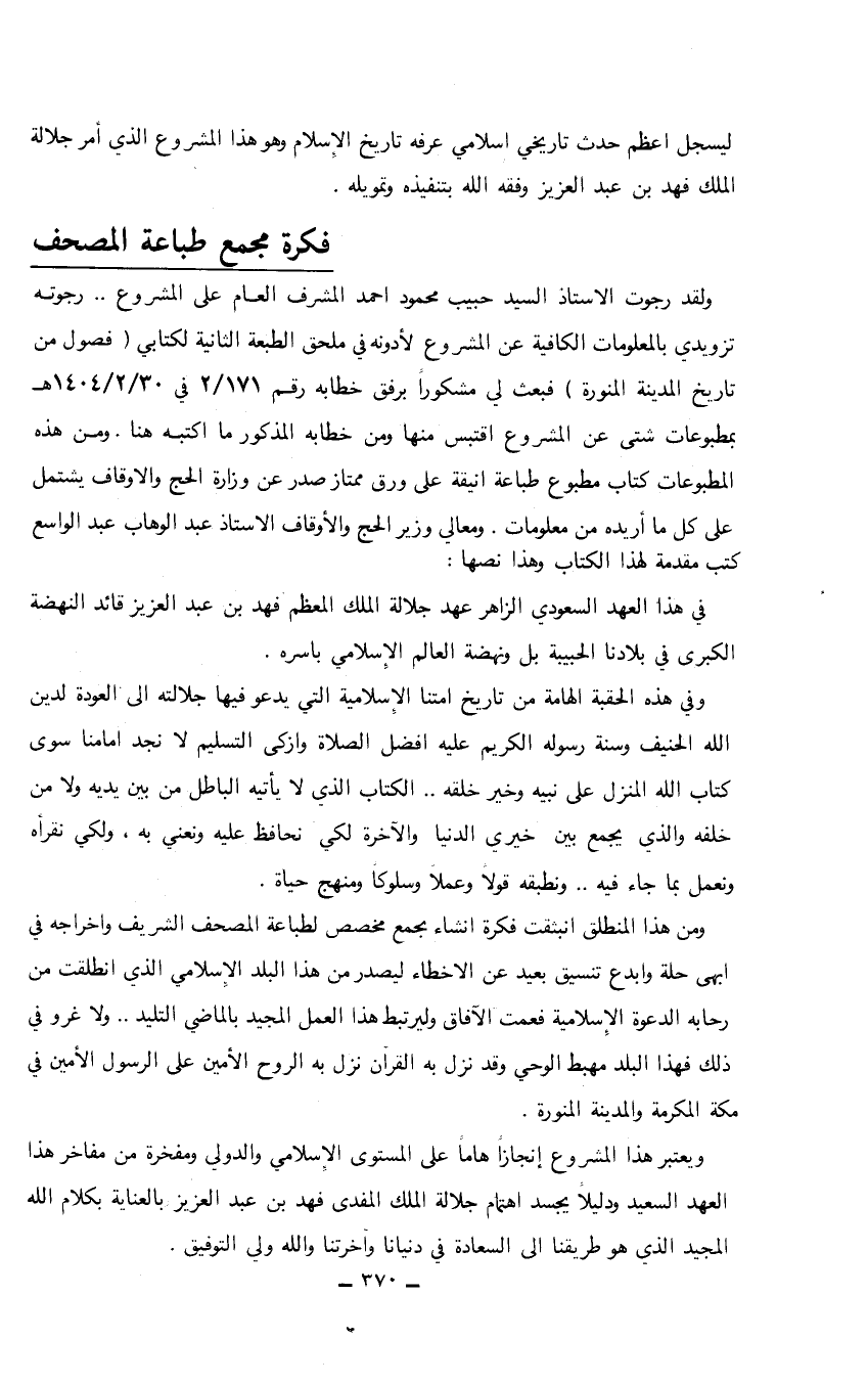 ويعتبر هذا المشروع إنجازاً هاماً على المستوى الإسلامي والدولي ومفخرة من مفاخر هذا العهد السعيد ودليلاً يجسد اهتمام جلالة الملك المفدى فهد بن عبد العزيز بالعناية بكلام الله المجيد الذي هو طريقنا إلى السعادة في دنيانا وآخرتنا والله ولي التوفيق.…