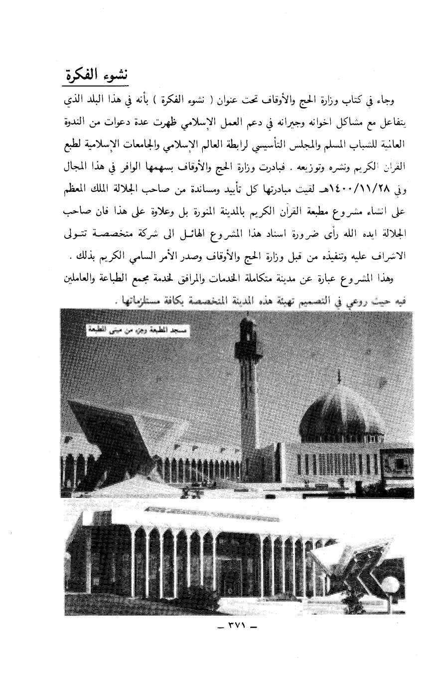 وجاء في كتاب وزارة الحج والأوقاف تحت عنوان (نشوء الفكرة) بأنه في هذا البلد الذي يتفاعل مع مشاكل اخوانه وجيرانه في دعم العمل الإسلامي ظهرت عدة دعوات من الندوة العالمية للشباب المسلم والمجلس التأسيسي لرابطة العالم الإسلامي والجامعات الإسلامية لطبع القرآن الكريم ونشره وتوزيعه. فبادرت وزارة الحج والأوقاف بسهمها الوافر في هذا المجال وفي 28/ 11/ 1400هـ لقيت مبادرتها كل تأييد ومساندة من صاحب الجلالة الملك المعظم على إنشاء مشروع مطبعة القرآن الكريم بالمدينة المنورة بل وعلاوة على هذا فإن صاحب الجلالة أيده الله رأى ضرورة اسناد هذا المشروع الهائل إلى شركة متخصصة تتولى الاشراف عليه وتنفيذه من قبل وزارة الحج والأوقاف وصدر الأمر السامي الكريم بذلك. وهذا المشروع عبارة عن مدينة متكاملة الخدمات والمرافق لخدمة مجمع الطباعة والعاملين فيه حيث روعي في التصميم تهيئة هذه المدينة المتخصصة بكافة مستلزماتها.…