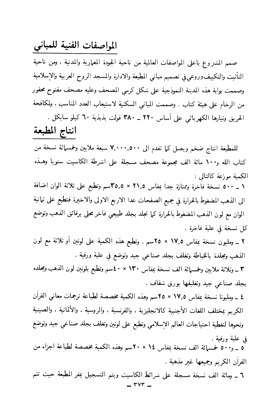 2 - ومليون نسخة بمقاس 17.5 × 25 سم. وتطبع هذه الكمية على لونين أو ثلاثة مع لون الذهب ومجلة بالخياطة وتغلف بجلد صناعي جيد وتوضع في علبة ورقية.