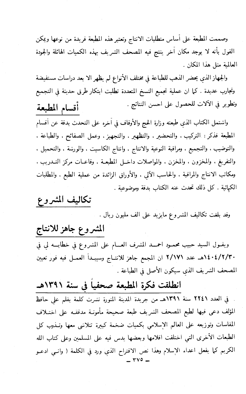 ويقول السيد حبيب محمود أحمد المشرف العام على المشروع في خطابه لي في 30/ 2/ 1404هـ عدد 171/ 2 أن المجمع جاهز للانتاج وسيبدأ العمل فيه فور تعيين المصحف الشريف الذي سيكون الأصل في الطباعة.