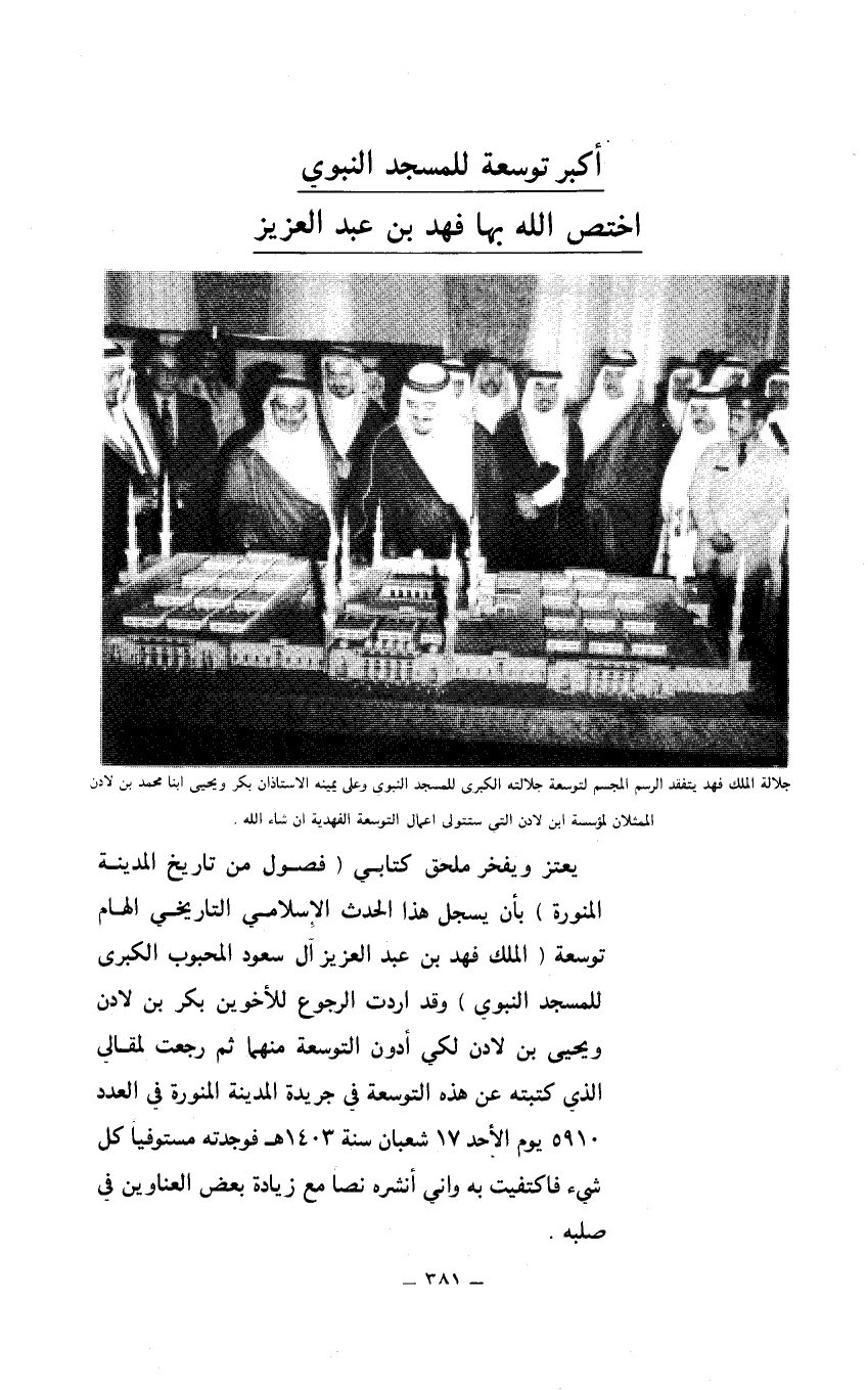 ((جلالة الملك فهد يتفقد الرسم المجسم لتوسعة جلالته الكبرى للمسجد النبوي وعلى يمينه الاستاذان بكر ويحيى ابنا محمد بن لادن الممثلان لمؤسسة ابن لادن التي ستتولى أعمال التوسعة الفهدية إن شاء الله)).