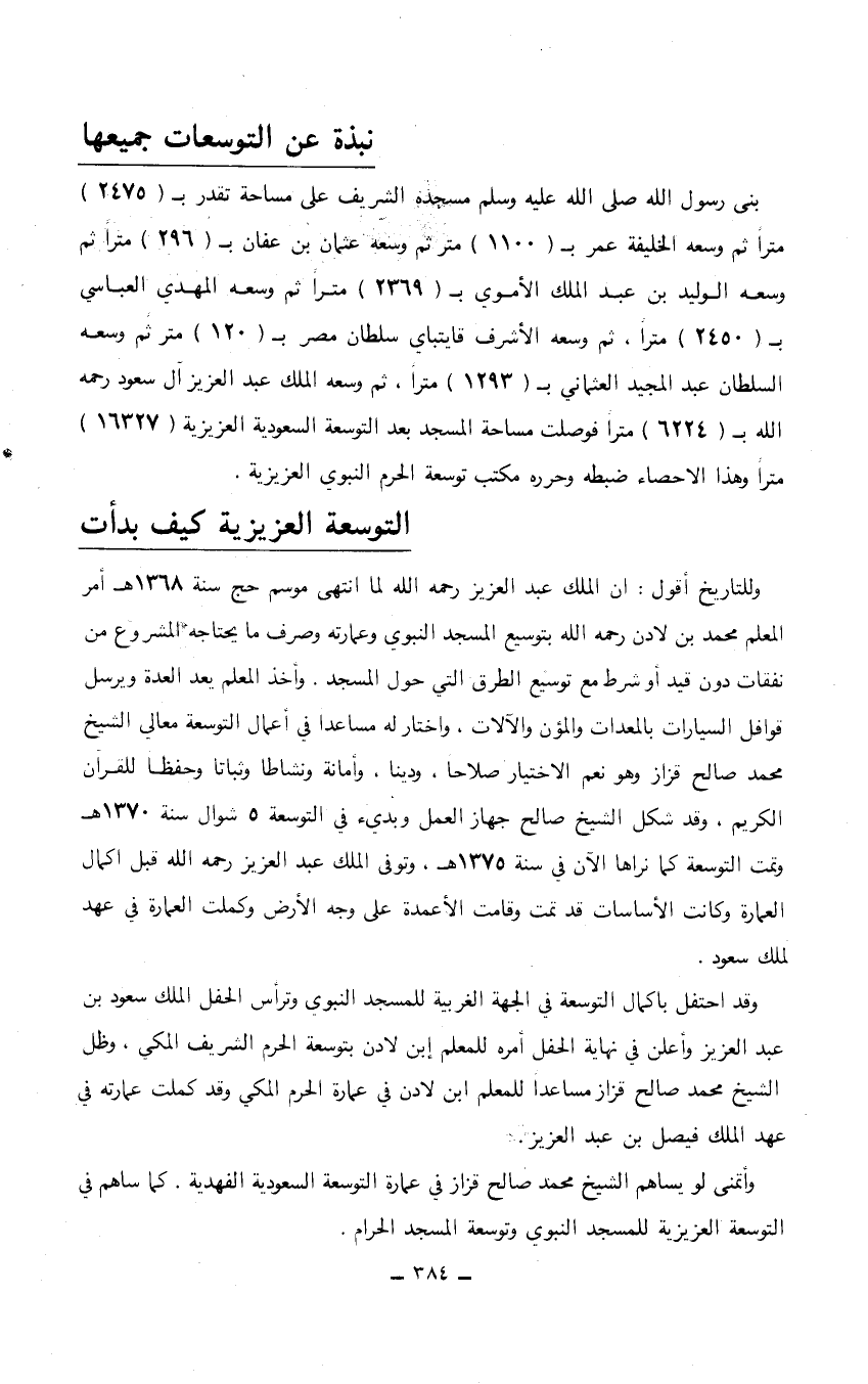 وللتاريخ أقول: أن الملك عبد العزيز رحمه الله لما انتهى موسم حج سنة 1368هـ أمر المعلم محمد بن لادن رحمه الله بتوسيع المسجد النبوي وعمارته وصرف ما يحتاجه المشروع من نفقات دون قيد أو شرط مع توسيع الطرق التي حول المسجد. وأخذ المعلم يعد العدة ويرسل قوافل السيارات بالمعدات والمؤن والآلات. واختار له مساعدا في أعمال التوسعة معالي الشيخ محمد صالح قزاز وهو نعم الاختيار صلاحا، ودينا، وأمانة ونشاطا وثباتاً وحفظاً للقرآن الكريم، وقد شكل الشيخ صالح جهاز العمل وبديء في التوسعة 5 شوال سنة 1370هـ وتمت التوسعة كما نراها الآن في سنة 1375هـ، وتوفي الملك عبد العزيز رحمه الله قبل اكمال العمارة وكانت الأساسات قد تمت وقامت الأعمدة على وجه الأرض وكملت العمارة في عهد لملك سعود.