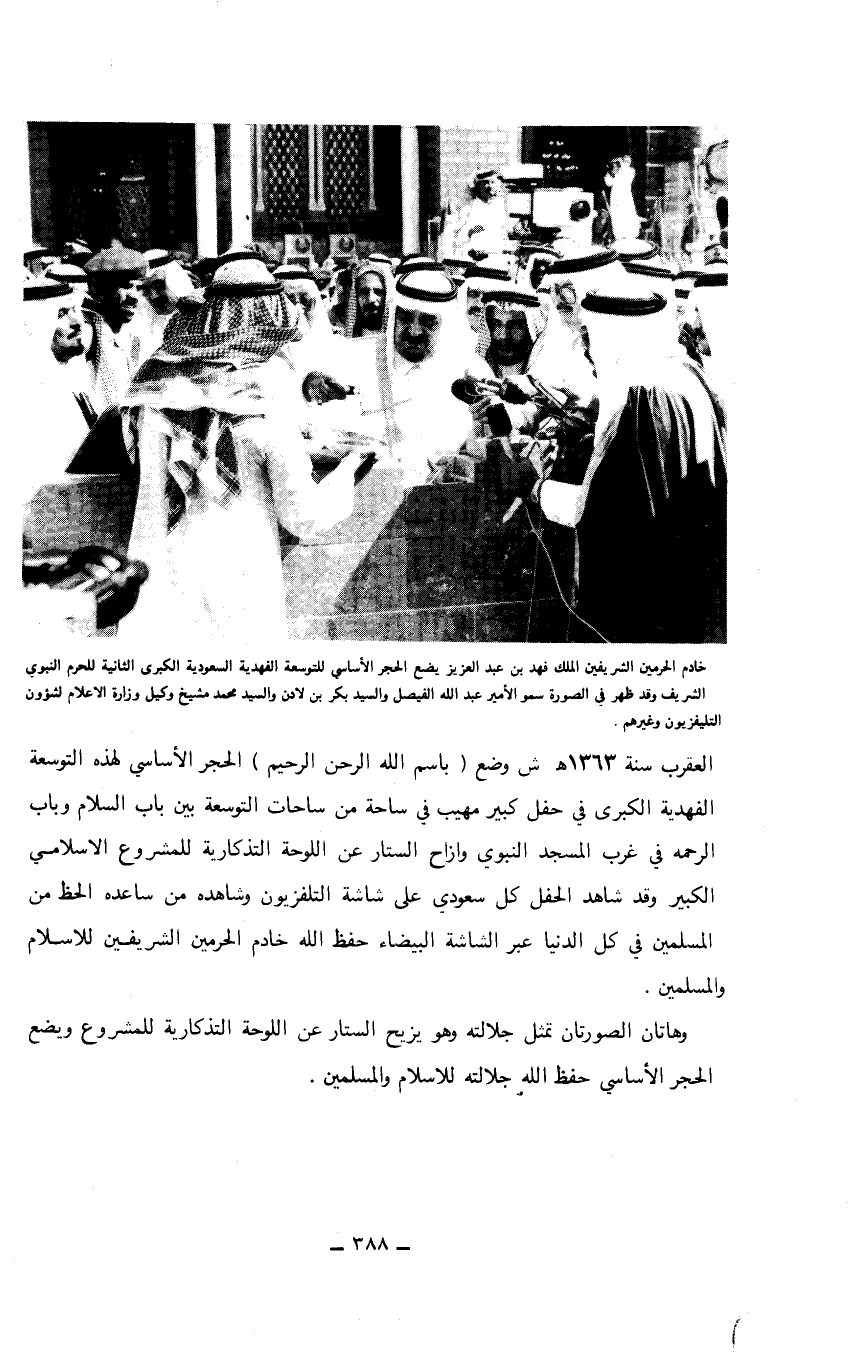 ((خادم الحرمين الشريفين الملك فهد بن عبد العزيز يضع الحجر الأساسي للتوسعة الفهدية السعودية الكبرى الثانية للحرم النبوي الشريف وقد ظهر في الصورة سمو الأمير عبد الله الفيصل والسيد بكر بن لادن والسيد محمد مشيخ وكيل وزارة الاعلام لشؤون التليفزيون وغيرهم)).