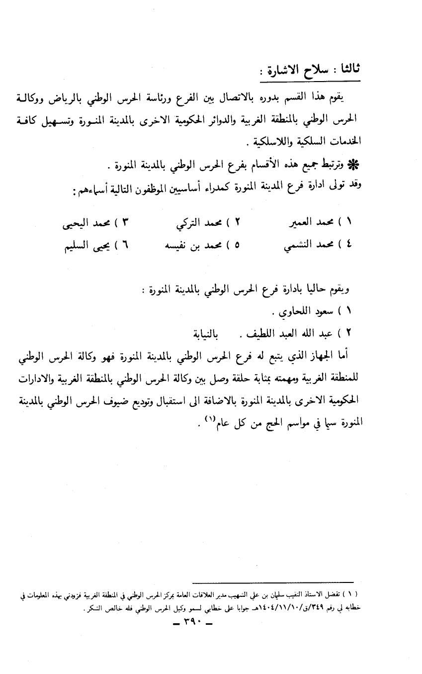 (1) تفضل الأستاذ النقيب سليمان بن علي الشهيب مدير العلاقات العامة بمركز الحرس الوطني في المنطقة الغربية فزودني بهذه المعلومات في خطابه لي رقم 249/ ق/10/ 11/ 1404هـ جواباً على خطابي لسمو وكيل الحرس الوطني فله خالص الشكر.