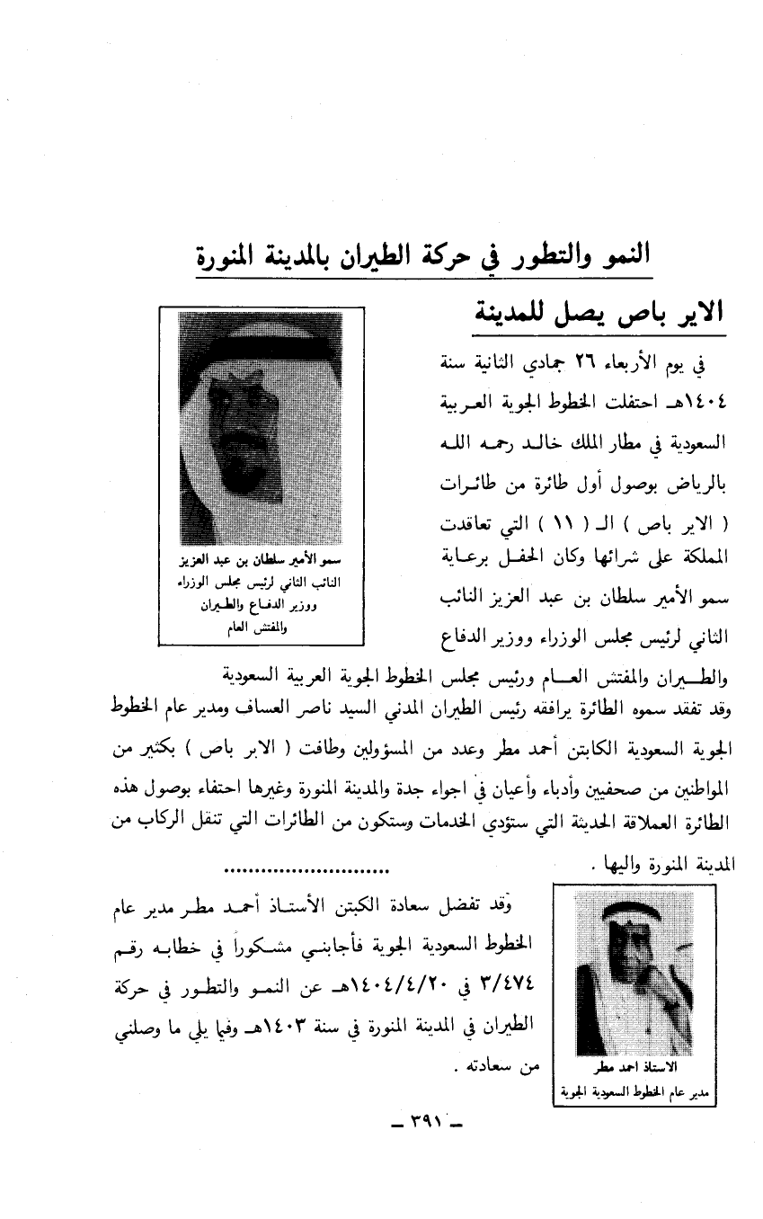 في يوم الأربعاء 26 جمادي الثانية سنة 1404هـ احتفلت الخطوط الجوية العربية السعودية في مطار الملك خالد رحمه الله بالرياض بوصول أول طائرة من طائرات (الأير باص) الـ (11) التي تعاقدت المملكة على شرائها وكان الحفل برعاية سمو الأمير سلطان بن عبد العزيز النائب الثاني لرئيس مجلس الوزراء ووزير الدفاع والطيران والمفتش العام ورئيس مجلس الخطوط الجوية العربية السعودية سمو الأمير سلطان بن عبد العزيز النائب الثاني لرئيس مجلس الوزراء ووزير الدفاع والطيران والمفتش العام وقد تفقد سموه الطائرة يرافقه رئيس الطيران المدني السيد ناصر العساف ومدير عام الخطوط الجوية السعودية الكابتن أحمد مطر وعدد من المسؤولين وطافت (الابر باص) بكثير من المواطنين من صحفيين وأدباء وأعيان في أجواء جدة والمدينة المنورة وغيرها احتفاء بوصول هذه الطائرة العملاقة الحديثة التي ستؤدي الخدمات وستكون من الطائرات التي تنقل الركاب من المدينة المنورة وإليها.
