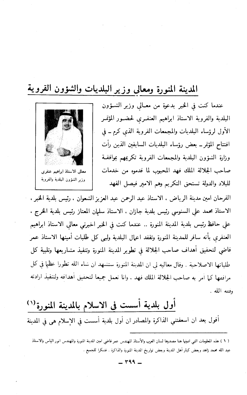 عندما كنت في الخبر بدعوة من معالي وزير الشؤون البلدية والقروية الاستاذ ابراهيم العنقري لحضور المؤتمر الأول لرؤساء البلديات والمجمعات القروية الذي كرم- في افتتاح المؤتمر- بعض رؤساء البلديات السابقين الذين رأت وزارة الشؤون البلدية والمجمعات القروية تكريمهم بموافقة صاحب الجلالة الملك فهد المحبوب لما قدموه من خدمات للبلاد والدولة تستحق التكريم وهم الأمير فيصل الفهد الفرحان أمين مدينة الرياض، الاستاذ عبد الرحمن عبد العزيز الشعوان، رئيس بلدية الخبر، الاستاذ محمد علي السنوسي رئيس بلدية جازان، الاستاذ سليمان المعتاز رئيس بلدية الخرج، علي حافظ رئيس بلدية المدينة المنورة .. عندما كنت في الخبر اخبرني معالي الاستاذ ابراهيم العنقري بأنه سافر للمدينة المنورة وتفقد أعمال البلدية ولبى كل طلبات أمينها الأستاذ عمر قاضي لتحقيق أهداف صاحب الجلالة في تطوير المدينة المنورة وتنفيذ مشاريعها وتلبية كل طلباتها الاصلاحية، وقال معاليه لي أن المدينة المنورة ستشهد إن شاء الله تطوراً عظيماً في كل مرافقها كما أمر به صاحب الجلالة الملك فهد، وأنا نعمل جميعاً لتحقيق أهداف ولتنفيذ ارادته وفقه الله.