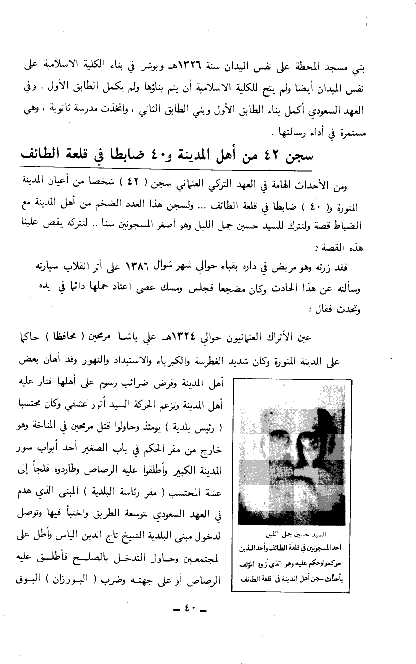 ((السيد حسين جمل الليل أحد المسجونين في قلعة الطائف وأحد الذين حوكموا وحكم عليه وهو الذي زود المؤلف بأحداث سجن أهل المدينة في قلعة الطائف)) …