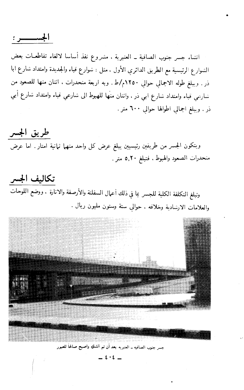 وتبلغ التكلفة الكلية للجسر بما في ذلك أعمال السفلتة والأرصفة والإنارة، ووضع اللوحات والعلامات الارشادية وخلافه، حوالي ستة وستون مليون ريال.