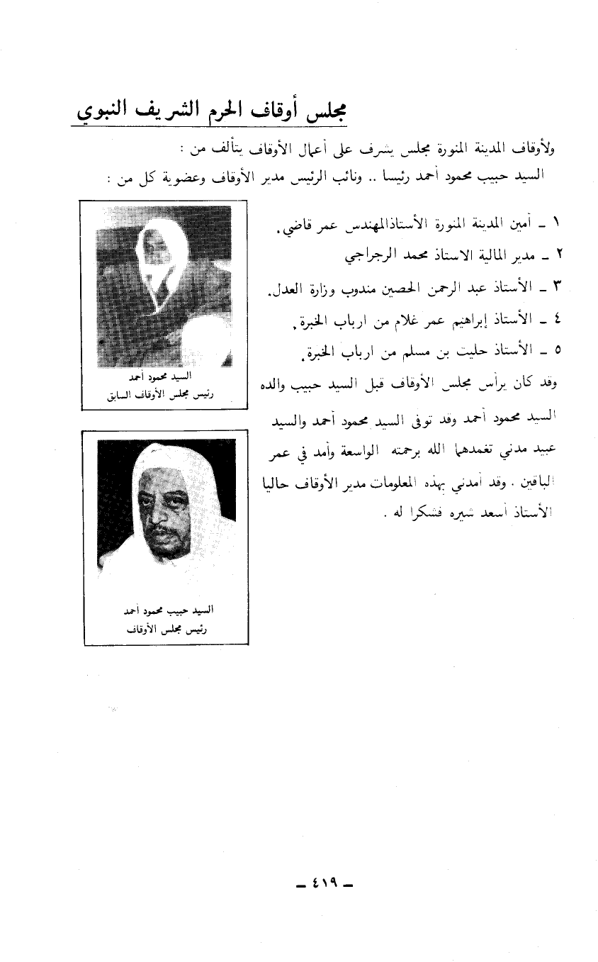 ولأوقاف المدينة المنورة مجلس يشرف على أعمال الأوقاف يتألف من: السيد حبيب محمود أحمد رئيساً ... نائب الرئيس مدير الأوقاف وعضوية كل من: