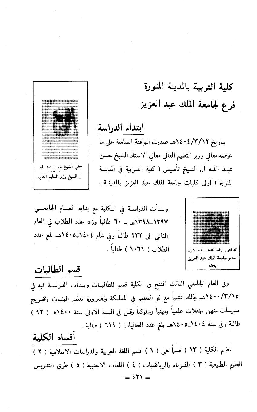 ابتداء الدراسة بتاريخ 12/ 3/ 1404هـ صدرت الموافقة السامية على ما عرضه معالي وزير التعليم العالي معالي الأستاذ الشيخ حسن عبدالله آل الشيخ تأسيس (كلية التربية في المدينة المنورة) أولى كليات جامعة الملك عبد العزيز بالمدينة، معالي الشيخ حسين عبدالله آل الشيخ وزير التعليم العالي وبدأت الدراسة في الكلية مع بداية العام الجامعي 1397 - 1398هـ بـ 60 طالباً وزاد عدد الطلاب في العام الثاني إلى 232 طالباً وفي عام 1404 - 1405هـ بلغ عدد الطلاب (1061) طالباً. الدكتور رضا محمد سعيد عبيد مدير جامعة الملك عبد العزيز بجدة قسم الطالبات وفي العام الجامعي الثالث افتتح في الكلية قسم للطالبات وبدأت الدراسة في 15/ 3/ 1400هـ وذلك تمشياً مع نمو التعليم في المملكة ولضرورة تعليم البنات وتخريج مدرسات منهن مؤهلات علمياً ومهنياً وسلوكياً وقبل في السنة الأولى سنة 1400هـ (92) طالبة وفي سنة 1404 - 1405هـ بلغ عدد الطالبات (619) طالبة.