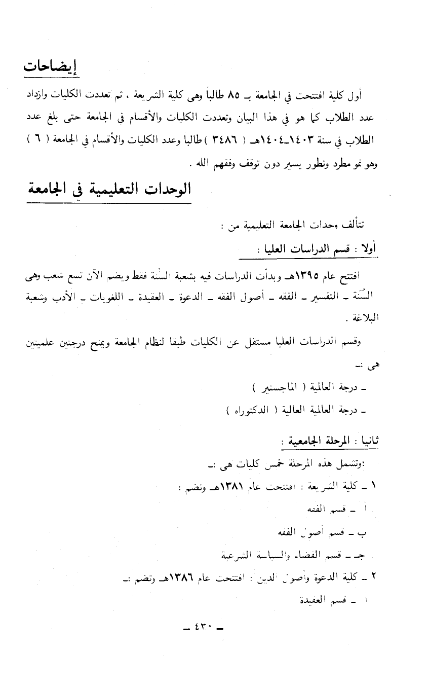 ثانياً: المرحلة الجامعية: وتشتمل هذه المرحلة خمس كليات هي: 1 - كلية الشريعة: افتتحت عام 1381هـ وتضم: أ- قسم الفقه ب- قسم أصول الفقه جـ- قسم الفضاء والسياسة الشرعية 2 - كلية الدعوة وأصول الدين: افتتحت عام 1386هـ وتضم: - قسم العقيدة…
