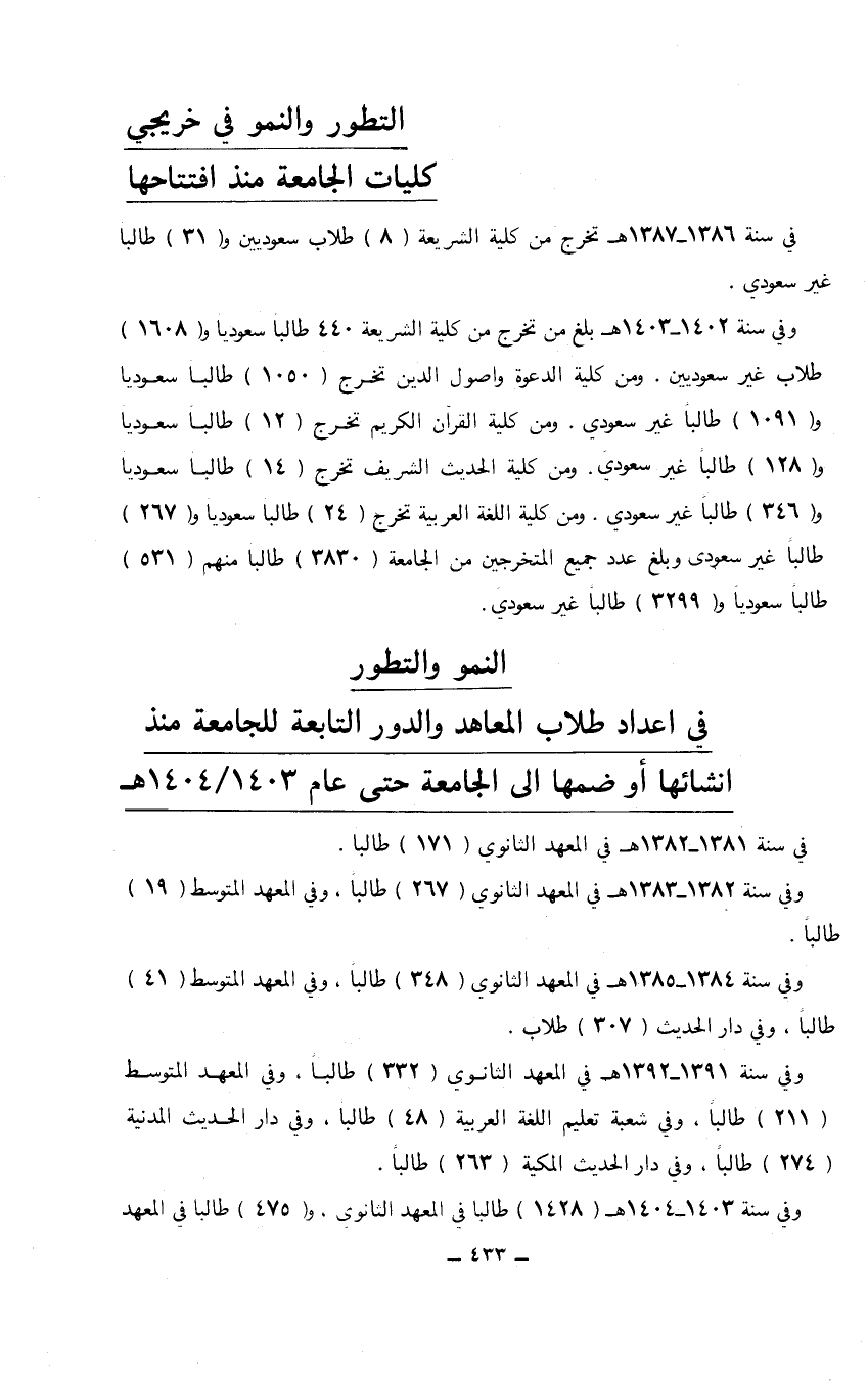 في سنة 1381 - 1382هـ في المعهد الثانوي (171) طالبا. وفي سنة 1382 - 1383هـ في المعهد الثانوي (267) طالباً، وفي المعهد المتوسط (19) طالباً. وفي سنة 1384 - 1385هـ ف المعهد الثانوي (348) طالباً، وفي المعهد المتوسط (41) طالباً، وفي دار الحديث (307) طلاب. وفي سنة 1391 - 1392هـ في المعهد الثانوي (332) طالباً، وفي المعهد المتوسط (211) طالباً، وفي شعبة تعليم اللغة العربية (48) طالباً، وفي دار الحديث المدينة (274) طالباً، وفي دار الحديث المكية (263) طالباً. وفي سنة 1403 - 1404هـ (1428) طالباً في المعهد الثانوي و (475) طالبا في المعهد…
