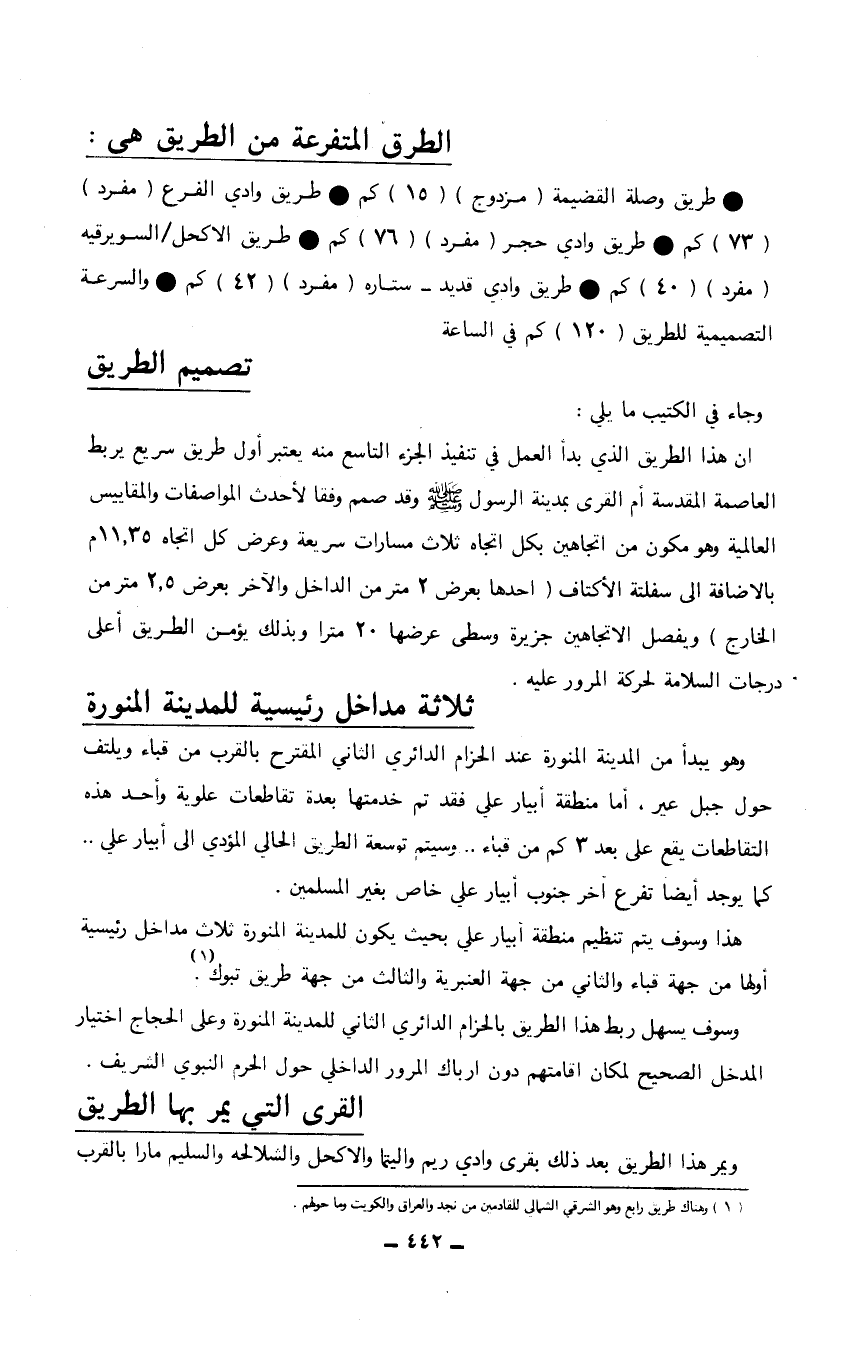 وجاء في الكتيب ما يلي: إن هذا الطريق الذي بدأ العمل في تنفيذ الجزء التاسع منه يعتبر أول طريق سريع يربط العاصمة المقدسة أم القرى بمدينة الرسول صلى الله عليه وسلم وقد صمم وفقاً لأحداث المواصفات والمقاييس العالمية وهو مكون من اتجاهين بكل اتجاه ثاث مسارات سريعة وعرض كل اتجاه 11.35م بالاضافة إلى سفلتة الأكتاف (احدها بعرض 2 متر من الداخل والآخر بعرض 2.5 متر من الخارج) ويفصل الاتجاهين جزيرة وسطى عرضها 20 متراً وبذلك يؤمن الطريق أعلى درجات السلامة لحركة المرور عليه.