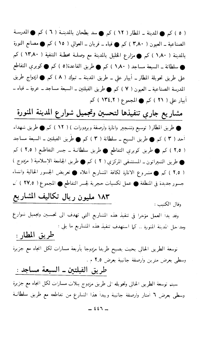 (5) كم * المدينة - المطار (12) كم * سد بطحان بالمدينة (6) كم * المدرسة الصناعية - العيون (3.80) كم * قباء- قربان - العوالي (15) كم * مصانع النورة بالمدينة (1.80) كم * مزارع الخليل بالمدينة مع وصلة محطة التنقية (13.80) كم * سلطانة - السبعة مساجد (1.80) كم * طريق القاعدة (5) كم * كوبري التقاطع على طريق تحويلة المطار - أبيار علي - طريق المدينة - تبوك (8) كم * ازدواج طريق المدرسة الصناعية - العيون (7) كم * طريق القبلتين - السبعة مساجد - عروة - قباء - أبيار علي (21) كم * المجموع (134.2) كم