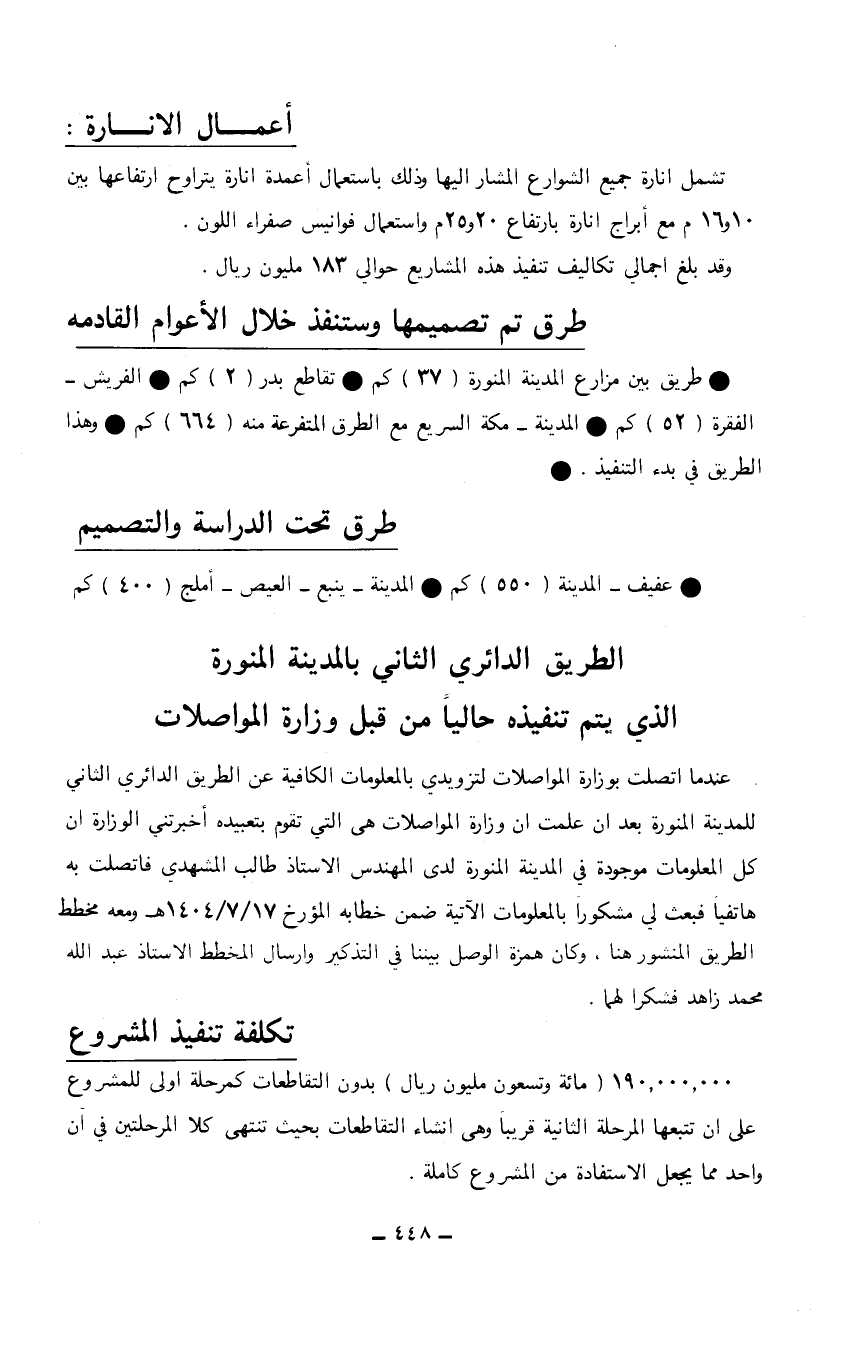 190.000.000 (مائة وتسعون مليون ريال) بدون التقطاعات كمرحلة أولى للمشروع على أن تتبعها المرحلة الثانية قريباً وهي انشاء التقاطعات بحيث تنتهي كلا المرحلتين في أن واحد مما يجعل الاستفادة من المشروع كاملة.…