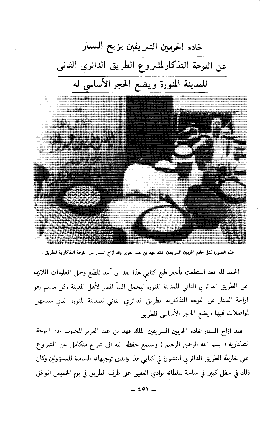 الحمد لله فقد استطعت تأخير طبع كتابي هذا بعد أن أعد للطبع وحمل المعلومات اللازمة عن الطريق الدائري الثاني للمدينة المنورة ليحمل النبأ المسر لأهل المدينة وكل مسلم وهو ازاحة الستار عن اللوحة التذكارية للطريق الدائري الثاني للمدينة المنورة الذي سيسهل المواصلات فيها ويضع الحجر الأساسي للطريق.
