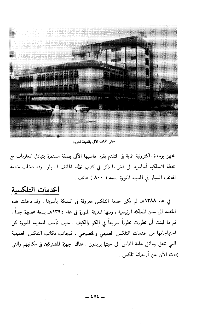 في عام 1388هـ لم تكن خدمة التلكس معروفة في المملكة بأسرها، وقد دخلت هذه الخدمة إلى مدن المملكة الرئيسية، ومنها المدينة المنورة في عام 1394هـ بسعة محدودة جداً، ثم ما لبثت أن تطورت تطوراً سريعاً في الكم والكيف، حيث تأمنت للمدينة المنورة كل احتياجاتها من خدمات التلكس العمومية التي تنقل رسائل عامة الناس إلى حيثما يريدون، هناك أجهزة المشتركين في مكاتبهم والتي زادت الآن عن أربعمائة تلكس.…