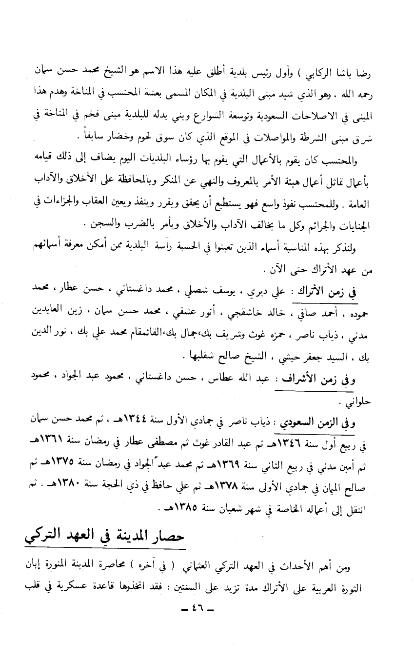 رضا باشا الركابي) وأول رئيس بلدية أطلق عليه هذا الاسم هو الشيخ محمد حسن سمان رحمه الله، وهو الذي شيد مبنى البلدية في المكان المسمى بعشة المحتسب في المناخة وهدم هذا المبنى في الاصلاحات السعودية وتوسعة الشوارع وبني بدله للبلدية مبنى فخم في المناخة في شرق مبنى الشرطة والمواصلات في الموقع الذي كان سوق لحوم وخضار سابقاً.