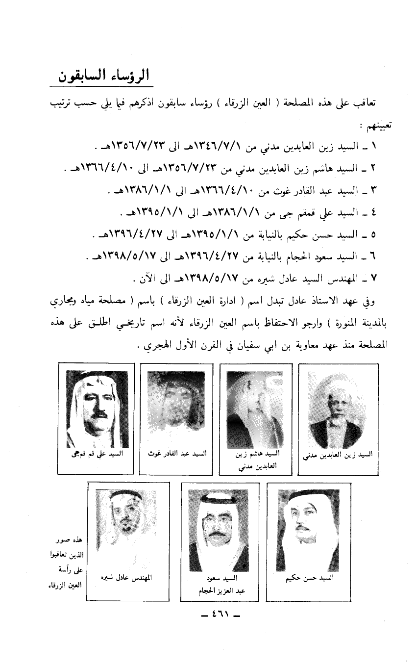 7 - المهندس السيد عادل شيره من 17/ 5/ 1398هـ إلى الآن. وفي عهد الأستاذ عادل تبدل اسم (ادارة العين الزرقاء) باسم (مصلحة مياه ومجاري بالمدينة المنورة) وارجو الاحتفاظ باسم العين الزرقاء لأنه اسم تاريخي أطلق على هذه المصلحة منذ عهد معاوية بن أبي سفيان في القرن الأول الهجري.