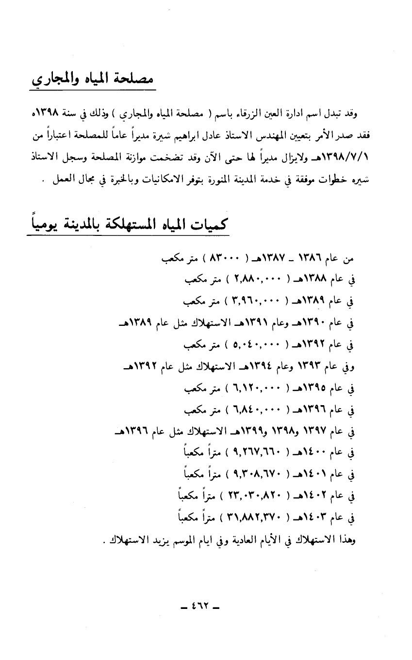 من عام 1386 - 1387هـ (83000) متر مكعب في عام 1388هـ (2.880.000) متر مكعب في عام 1389هـ (3.960.000) متر مكعب في عام 1390هـ وعام 1391هـ الاستهلاك مثل عام 1389هـ في عام 1392هـ (5.040.000) متر مكعب في عام 1393 وعام 1394هـ الاستهلاك مثل عام 1392هـ في عام 1395هـ (6.120.000) متر مكعب في عام 1396هـ (6.840.000) متر مكعب في عام 1397 و 1398 و 1399 هـ الاستهلاك مثل عام 1396هـ في عام 1400هـ (9.267.660) متراً مكعباً. في عام 1401هـ (9.308.670) متراً مكعباً. في عام 1402هـ (23.030.820) متراً مكعباً. في عام 1403هـ (31.882.370) متراً مكعباً. وهذا الاستهلاك في الأيام العادية وفي أيام الموسم يزيد الاستهلاك.…
