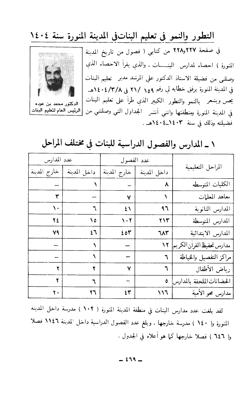 في صفحة 227 و 228 من كتابي (فصول من تاريخ المدينة المنورة) احصاء لمدارس البنات، والذي يقرأ الاحصاء الذي وصلني من فضيلة الاستاذ الدكتور علي المرشد مدير تعليم البنات في المدينة المنورة برفق خطابه لي رقم 159/ 21 في 8/ 3/ 1404هـ يحس ويشعر بالنمو والتطور الكبير الذي طرأ على تعليم البنات في المدينة المنورة ومنطقتها وأنني أنشر الجداول التي وصلتني من فضيلته وذلك في سنة 1403 - 1404هـ. الدكتور محمد بن عوده الرئيس العام لتعليم البنات