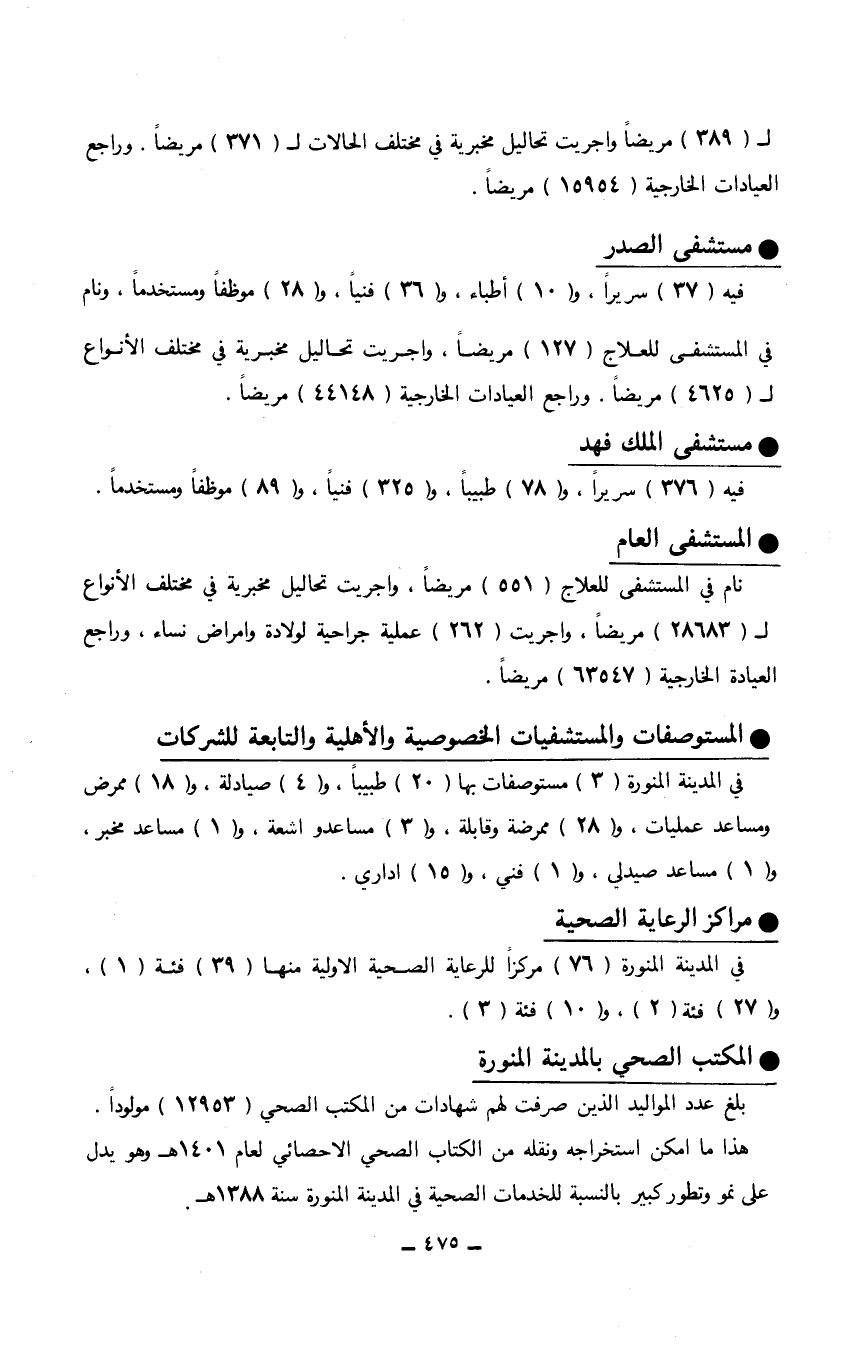 لـ (389) مريضاً واجريت تحاليل مخبرية في مختلف الحالات لـ (371) مريضاً. وراجع العيادات الخارجية (15954) مريضاً. * مستشفى الصدر فيه (37) سريراً، و (10) أطباء، و (36) فنياً، و (28) موظفاً ومستخدماً، ونام في المستشفى للعلاج (127) مريضاً، واجريت تحاليل مخبرية في مختلف الأنواع لـ (4625) مريضاً. وراجع العيادات الخارجية (44148) مريضاً. * مستشفى الملك فهد فيه (376) سريراً، و (78) طبيباً، و (325) فنياً، و (89) موظفاً ومستخدماً. * المستشفى العام نام في المستشفى للعلاج (551) مريضاً، واجريت تحاليل مخبرية في مختلف الأنواع لـ (28683) مريضاً، واجريت (262) عملية جراحية لولادة وامراض نساء، وراجع العيادة الخارجية (63547) مريضاً. * المستوصفات والمستشفيات الخصوصية والأهلية والتابعة للشركات في المدينة المنورة (3) مستوصفات بها (20) طبيباً، و (4) صيادلة، و (18) ممرض ومساعد عمليات، و (28) ممرضة وقابلة، و (3) مساعدو أشعة، و (1) مساعد مخبر، و (1) مساعد صيدلي، و (1) فني، و (15) إداري. * مراكز الرعاية الصحية في المدينة المنورة (76) مركزاً للرعاية الصحية الأولية منها (39) فئة (1)، و (27) فئة (2)، و (10) فئة (3). * المكتب الصحي بالمدينة المنورة بلغ عدد المواليد الذين صرفت لهم شهادات من المكتب الصحي (12953) مولوداً. هذا ما أمكن استخراجه ونقله من الكتاب الصحي الاحصائي لعام 1401هـ وهو يدل على نمو وتطور كبير بالنسبة للخدمات الصحية في المدينة المنورة سنة 1388هـ.…