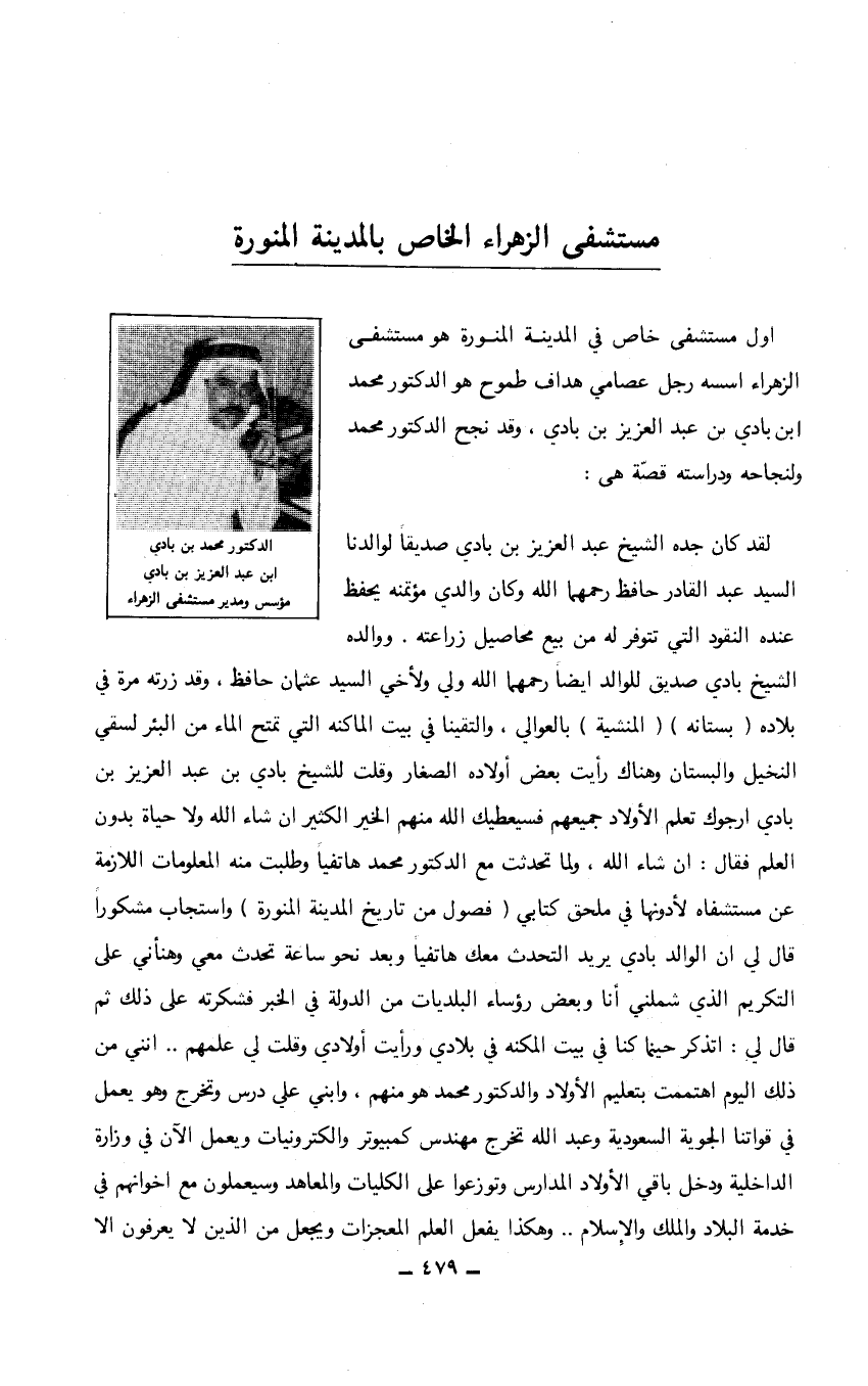 الدكتور محمد بن بادي ابن عبد العزيز بن بادي مؤسس ومدير مستشفى الزهراء لقد كان جده الشيخ عبد العزيز بن بادي صديقاً لوالدنا السيد عبد القادر حافظ رحمها الله وكان والدي مؤتمنه يحفظ عنده النقود التي تتوفر له من بيع محاصيل زراعته. والده الشيخ بادي صديق للوالد أيضاً رحمهما الله ولي ولأخي السيد عثمان حافظ، وقد زرته مرة في بلاده (بستانه) (المنشية) بالعوالي، والتقينا في بيت الماكنه التي تمتح الماء من البئر لسقي النخيل والبستان وهناك رأيت بعض أولاده الصغار وقلت للشيخ بادي بن عبد العزيز بن بادي أرجوك تعلم الأولاد جميعهم فسيعطيك الله منهم الخير الكثير ان شاء الله ولا حياة بدون العلم فقال: إن شاء الله، ولما تحدثت مع الدكتور محمد هاتفياً وطلبت منه المعلومات اللازمة عن مستشفاه لأدونها في ملحق كتابي (فصول من تاريخ المدينة المنورة) واستجاب مشكوراً قال لي أن الوالد بادي يريد التحدث معك هاتفياً وبعد نحو ساعة تحدث معي وهنأني على التكريم الذي شملني أنا وبعض رؤساء البلديات من الدولة في الخبر فشكرته على ذلك ثم قال لي: اتذكر حينما كنا في بيت المكنه في بلادي ورأيت أولادي وقلت لي علمهم ... أنني من ذلك اليوم اهتممت بتعليم الأولاد والدكتور محمد هو منهم، وابني علي درس وتخرج وهويعمل في قواتنا الجوية السعودية وعبدالله تخرج مهندس كمبيوتر والكترونيات ويعمل الآن في وزارة الداخلية ودخل باقي الأولاد المدارس وتوزعوا على الكليات والمعاهد وسيعلمون مع اخوانهم في خدمة البلاد والملك والإسلام ... وهكذا يفعل العلم المعجزات ويجعل من الذين لا يعرفون إلا…
