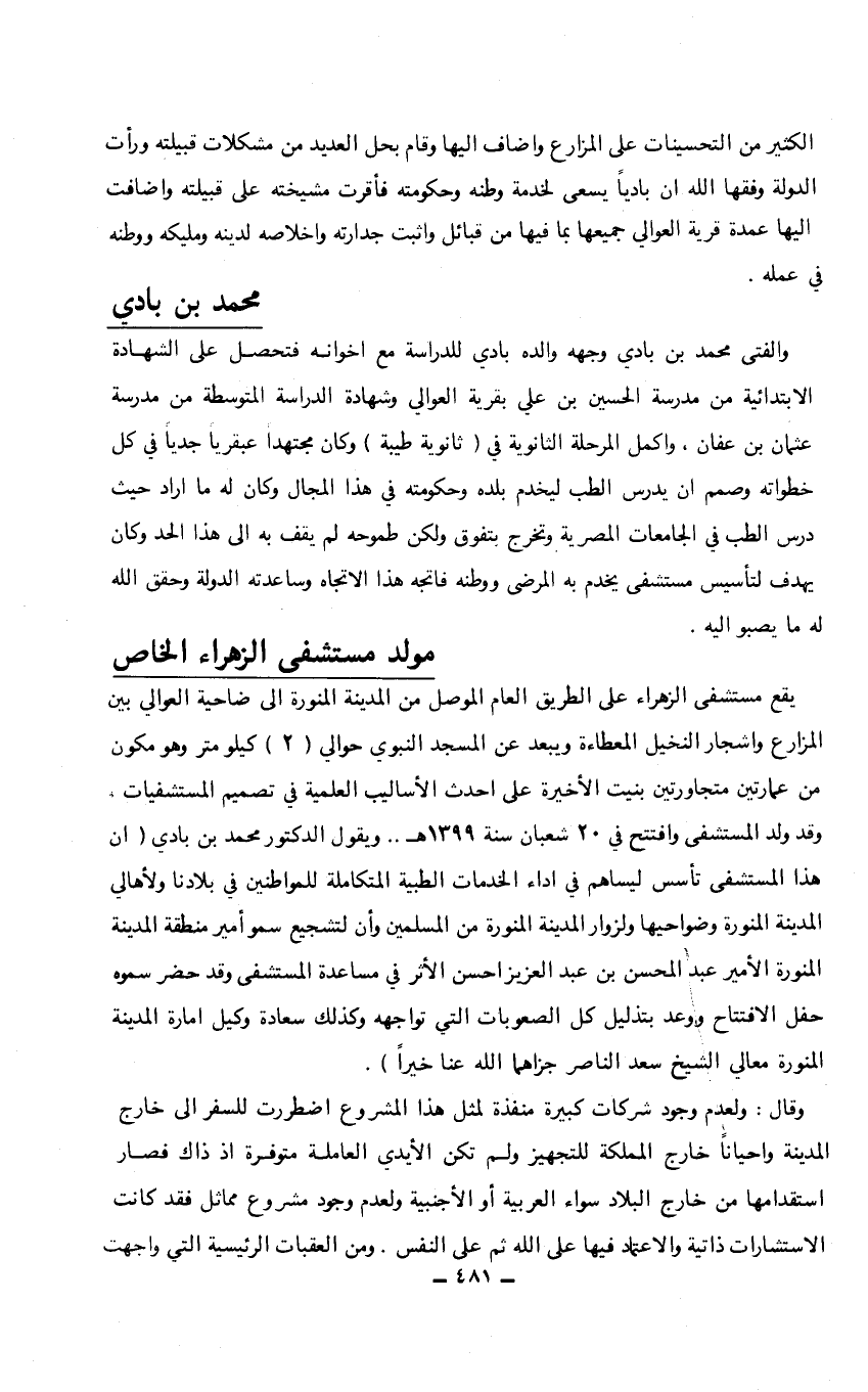 يقع مستشفى الزهراء على الطريق العام الموصل من المدينة المنورة إلى ضاحية العوالي بين المزارع وأشجار النخيل المعطاة ويبعد عن المسجد النبوي حوالي (2) كيلو متر وهو مكون من عمارتين متجاورتين بنيت الأخيرة على أحدث الأساليب العلمية في تصميم المستشفيات، وقد ولد المستشفى وافتتح في 20 شعبان سنة 1399هـ .. ويقول الدكتور محمد بن بادي (أن هذا المستشفى تأسس ليساهم في أداء الخدمات الطبية المتكاملة للمواطنين في بلادنا ولأهالي المدينة المنورة وضواحيها ولزوار المدينة المنورة من المسلمين وأن لتشجيع سمو أمير منطقة المدينة المنورة الأمير عبد المحسن بن عبد العزيز أحسن الأثر في مساعدة المستشفى وقد حضر سموه حفل الافتتاح ووعد بتذليل كل الصعوبات التي تواجهه وكذلك سعادة وكيل امارة المدينة المنورة معالي الشيخ سعد الناصر جزاهما الله عنا خيراً). وقال: ولعدم وجود شركات كبيرة منفذة لمثل هذا المشروع اضطررت للسفر إلى خارج المدينة وأحياناً خارج المملكة للتجهيز ولم تكن الأيدي العاملة متوفرة إذ ذاك فصار استقدامها من خارج البلاد سواء العربية أو الأجنبية ولعدم وجود مشروع مماثل فقد كانت الاستشارات ذاتية والاعتماد فيها على الله ثم على النفس. ومن العقبات الرئيسية التي واجهت…