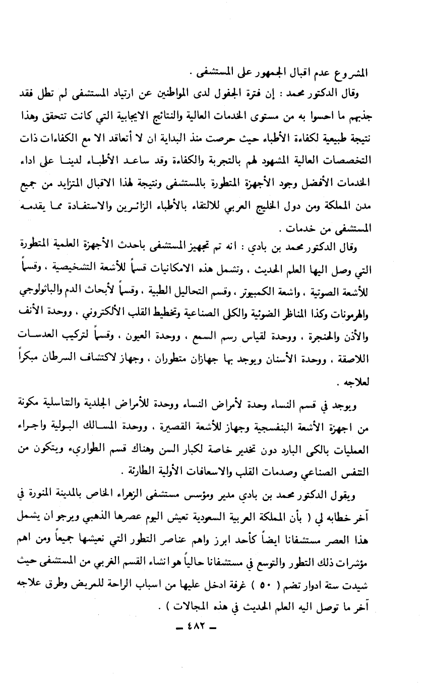 وقال الدكتور محمد: إن فترة الجفول لدى المواطنين عن ارتياد المستشفى لم تطل فقد جذبهم ما احسوا به من مستوى الخدمات العالية والنتائج الايجابية التي كانت تتحقق وهذا نتيجة طبيعة لكفاءة الأطباء حيث حرصت منذ البداية أن لا أتعاقد إلا مع الكفاءات ذات التخصصات العالية المشهود لهم بالتجربة والكفاءة وقد ساعد الأطباء لدينا على أداء الخدمات الأفضل وجود الأجهزة المتطورة بالمستشفى ونتيجة لهذا الاقبال المتزايد من جميع مدن المملكة ومن دول الخليج العربي للالتقاء بالأطباء الزائرين والاستفادة مما يقدمه المستشفى من خدمات. وقال الدكتور محمد بن بادي: أنه تم تجهيز المستشفى باحدث الأجهزة العلمية المتطورة التي وصل إليها العلم الحديث، وتشمل هذه الامكانيات قسماً للأشعة التشخيصية، وقسماً للأشعة الصوتية، وأشعة الكمبيوتر، وقسم التحاليل الطبية، وقسماً لأبحاث الدم والباثولوجي والهرمونات وكذا المناظر الضوئية والكلى الصناعية وتخطيط القلب الألكتروني، ووحدة الأنف والأذن والحنجرة، ووحدة لقياس رسم السمع، ووحدة العيون، وقسماً لتركيب العدسات اللاصقة، ووحدة الأسنان ويوجد بها جهازان متطوران، وجهاز لاكتشاف السرطان مبكراً لعلاجه. ويوجد في قسم النساء وحدة لأمراض النساء ووحدة للأمراض الجلدية والتناسلية مكونة من أجهزة الأشعة البنفسجية وجهاز للأشعة القصيرة، ووحدة المسالك البولية واجراء العمليات بالكلى البارد دون تخدير خاصة لكبار السن وهناك قسم الطواريء ويتكون من التنفس الصناعي وصدمات القلب والاسعافات الأولية الطارئة. ويقول الدكتور محمد بن بادي مدير ومؤسس مستشفى الزهراء الخاص بالمدينة المنورة في آخر خطابه لي (بأن المملكة العربية السعودية تعيش اليوم عصرها الذهبي ويرجو أن يشمل هذا العصر مستشفانا أيضاً كأحد أبرز واهم عناصر التطور التي نعيشها جميعاً ومن أهم مؤشرات ذلك التطور والتوسع في مستشفانا حالياً هو انشاء القسم الغربي من المستشفى حيث شيدت ستة أدوار تضم (50) غرفة ادخل عليها من أسباب الراحة للمريض وطرق علاجه آخر ما توصل إليه العلم الحديث في هذه المجالات).…