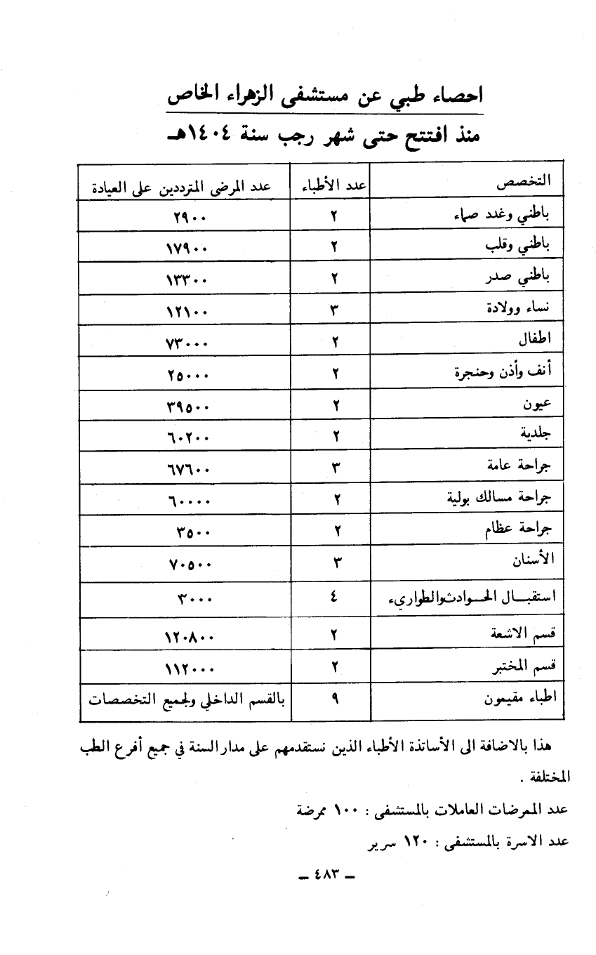 احصاء طبي عن مستشفى الزهراء الخاص منذ افتتح حتى شهر رجب سنة 1404هـ