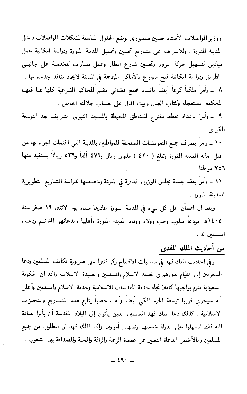 وفي أحاديث الملك فهد في مناسبات الافتتاح ركز كثيراً على ضرورة تكاتف المسلمين ودعا السعوديين إلى القيام بدورهم في خدمة الاسلام والمسلمين والعقيدة الاسلامية وأكد أن الحكومة السعودية تقوم بواجبها كاملاً تجاه خدمة المقدسات الاسلامية وخدمة الاسلام والمسلمين وأعلن أنه سيجري قريباً توسعة الحرم المكي أيضاً وأنه شخصياً يتابع هذه المشاريع والمنجزات الاسلامية. كذلك دعا الملك فهد المسلمين الذين يأتون إلى البلاد المقدسة أن يأتوا لعبادة الله فقط ليسهلوا على الدولة خدمتهم وتسهيل أمورهم وأكد الملك فهد أن المطلوب من جميع المسلمين وبالأخص الدعاة التعبير عن عقيدة الرحمة والرأفة والمحبة وللصداقة بين الشعوب.…
