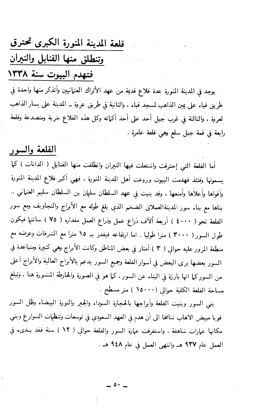 أما القلعة التي إحترقت واشتعلت فيها النيران وانطلقت منها القنابل (الدانات) كما يسمونها وقتئذ فهدمت البيوت وروعت أهل المدينة المنورة، فهي أكبر قلاع المدينة المنورة وأقواها وأعلاها وأمنعها، وقد بنيت في عهد السلطان سليمان بن السلطان سليم العثماني ... بناها مع بناء سور المدينة العملاق الضخم الذي بلغ طوله مع الأبراج والتجاويف ومع سور القلعة نحو (4000) أربعة آلاف ذراع عمل وذراع العمل مقداره (75) سانتيما فيكون طول السور (3000) مترا طوليا. أما ارتفاعه فيقدر بـ15 مترا مع الشرفات وعرضه مع منطقة المرور عليه حوالي (3) أمتار في بعض المناطق وكانت الأبراج وهي كثيرة ومتباعدة في السور بعضها يرى البعض في أسوار القلعة وجميع السور يدعم بالأبراج العالية والأبراج أعلى من السور كما أنها بارزة في البناء عن السور، كما هو في الصورة والخارطة المنشورة هنا، وتبليغ مساحة القلعة الكلية حوالي (15000) متر مسطح.